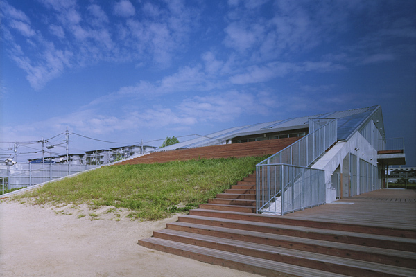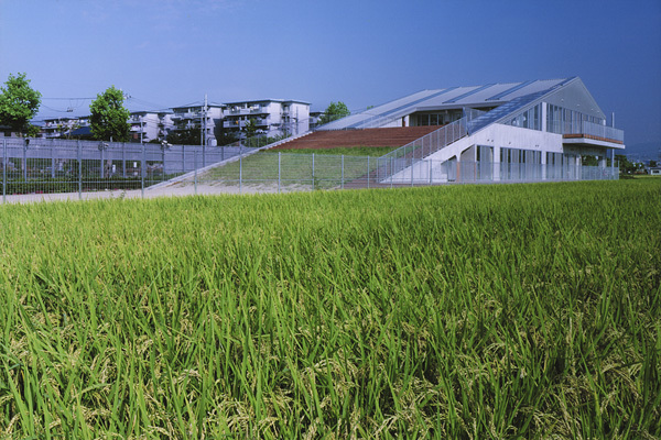 街中に残った田んぼ。そこに、稲穂の草原へとつながる床と、子供がのぼり見渡せる丘をつくる。