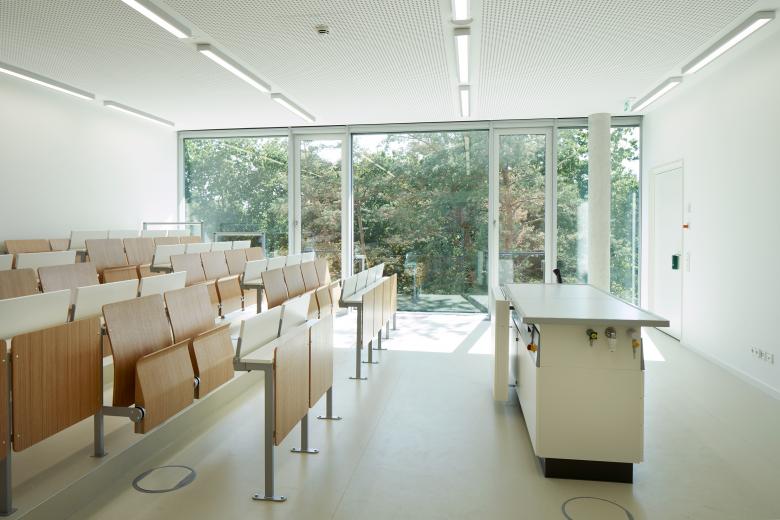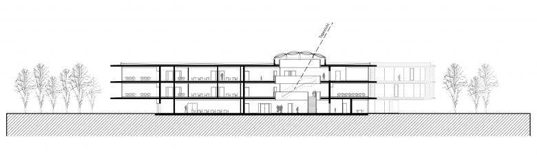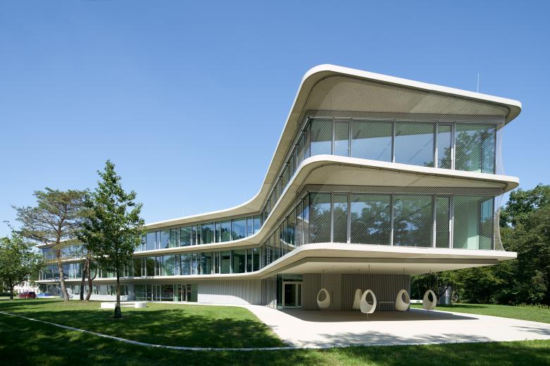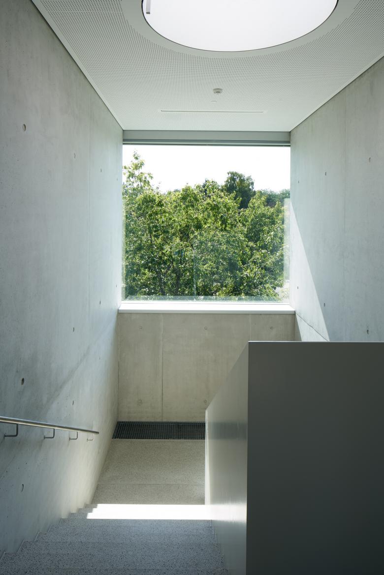Um die beeindruckend großzügigen Grünflächen maximal zu schonen, wurde das Gebäude dreigeschossig konzipiert. Weit in das Grün auskragende Flügelenden erzeugen einen leichten, schwebenden Charakter. Die beiden schwebenden, großzügig verglasten Obergeschosse nehmen die Unterrichtsräume auf, das Erdgeschoss die »öffentlichen« Funktionen.