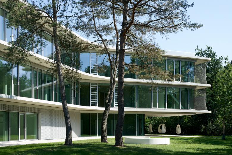 Eine vorgesetzte »zweite Haut« schützt das Gebäude vor Sonneneinstrahlung und kann zusätzlich als Wartungsgang genutzt werden. Raumhohe, schwenkbare Sonnenschutzelemente in Verbindung mit der geschwungenen Gebäudeform erzeugen ein lebendiges, abwechslungsreiches Erscheinungsbild, das die Kontinuität von Landschaftsraum und Gebäude weiter betont.