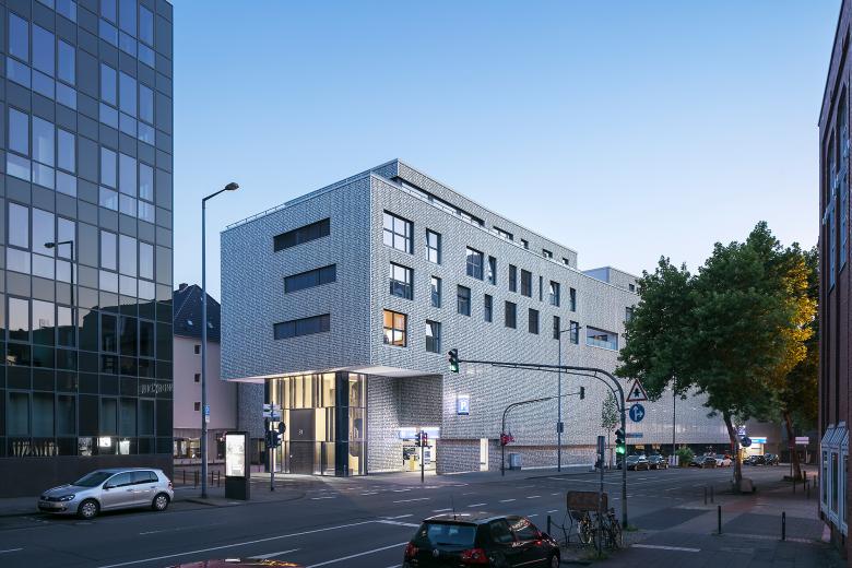 Die bisher von der Autonutzung geprägte innerstädtische Situation der Magnusstraße wird durch die schillernde, perlbeige Fassade zurückhaltend und doch signifikant aufgewertet.