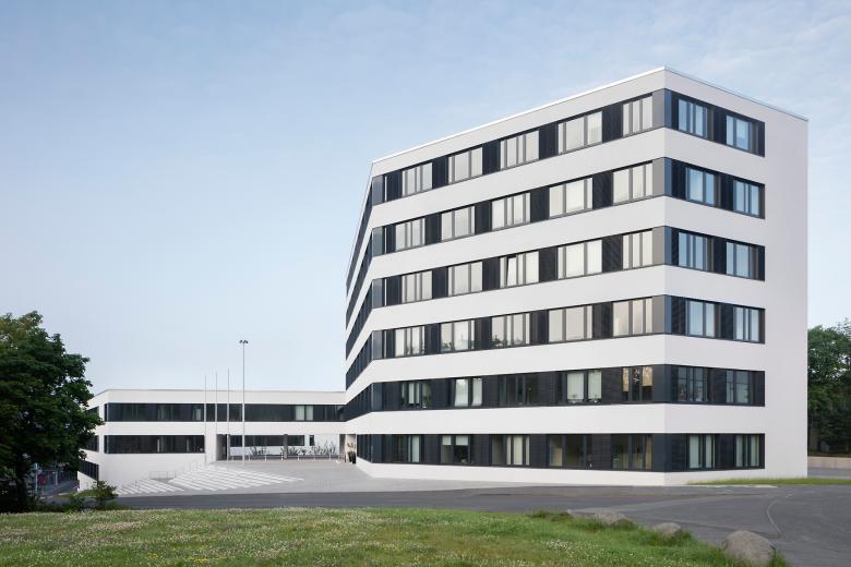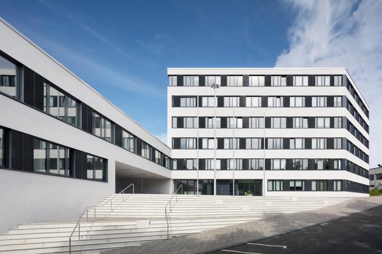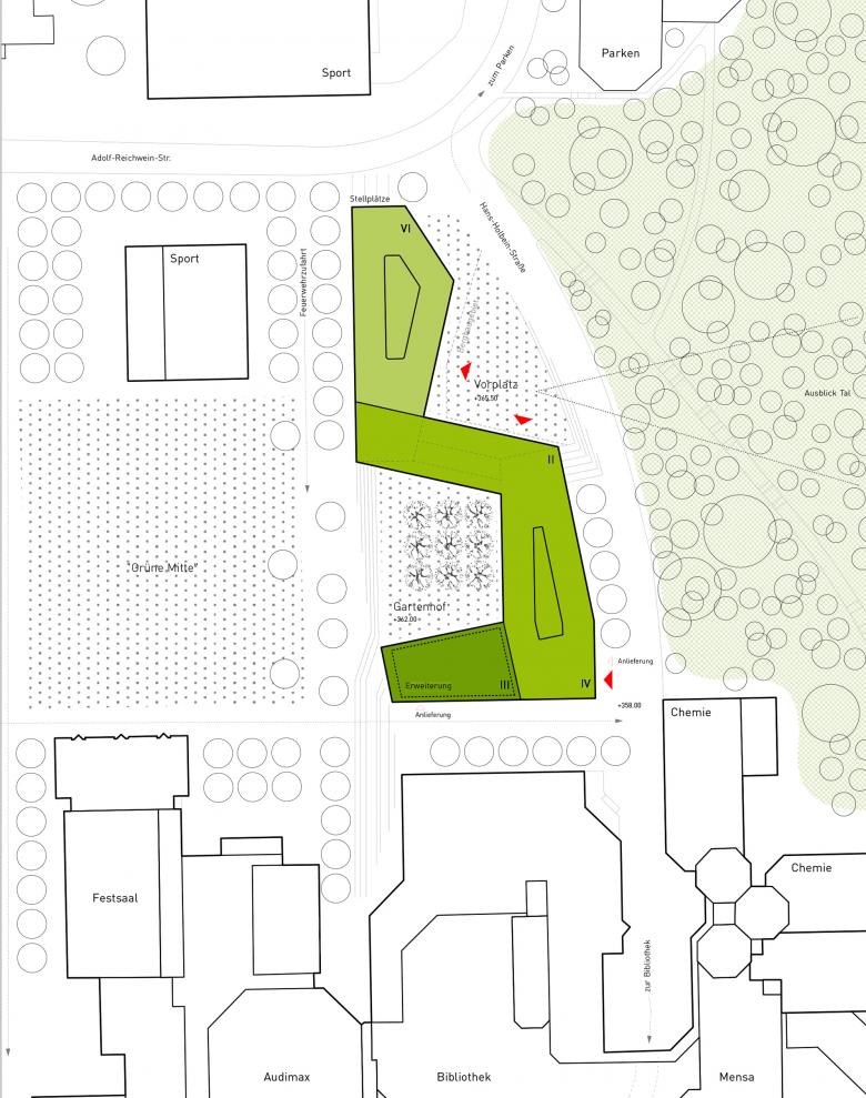 Die Gebäudefigur umschliesst zwei neue Freiräume mit unterschiedlichen Charakteren: Der repräsentative, städtische Vorplatz am Nordturm orientiert sich zur fußläufigen Haupterschließung der Universität und öffnet sich zum Landschaftsraum nach Osten, auf der anderen Seite richtet sich ein ruhiger Gartenhof zur „grünen Mitte“ des Campus nach Westen aus. Vernetzt werden diese Räume über die Campus-Loggia, die mittels einer Außentreppe eine offene Verbindung zum Gartenhof schafft.