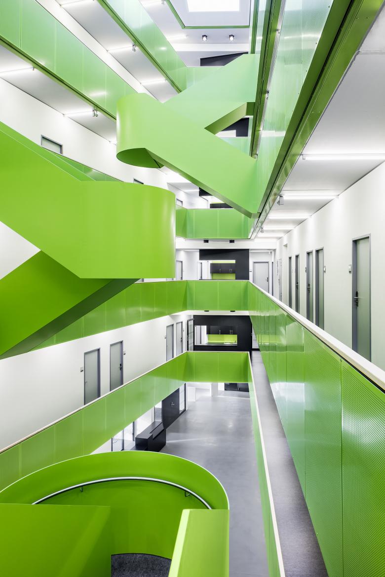 Der bauherrnseitigen Anforderung an häufige Nutzungsänderungen während des Lebenszyklus wurde baukonstruktiv z.B. mit dem Tragwerk in Skelettbauweise mit Flachdecken (Nutzlasten mind. 5 kN/qm), gerasterten Fassadenanschlüssen und der Stellung der Trennwände auf dem Estrich Rechnung getragen. Das Brandschutzkonzept sieht keine notwendigen Flure sondern Nutzungseinheiten zwischen den Treppenkernen vor. Damit wird eine sehr flexible Nutzung bis hin zur Einrichtung von Großraumbüros möglich. Die offene Installation der Haustechnik oberhalb elementierter Streckmetalldecken ermöglicht die einfache Um- bzw. Nachrüstung aller technischen Komponenten.