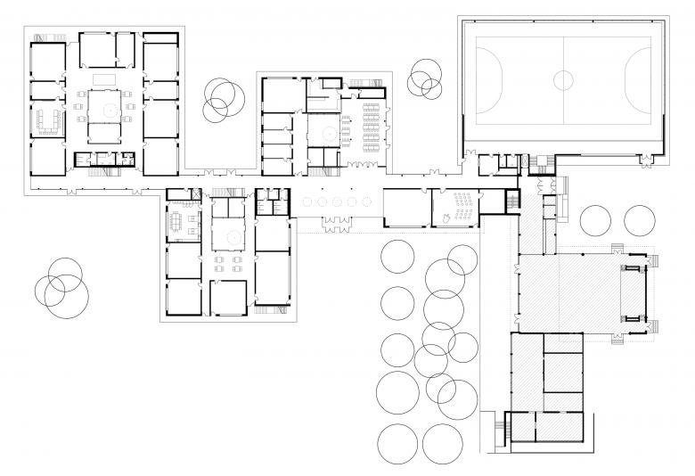 Ein Ensemble von Klassenhäusern erweitert den Bestand. Die Pavillonstruktur mit differenzierten Außenräumen ergänzt die bestehenden Kultureinrichtungen um ein zentrales Forum - dem neuen Herz des Schulzentrums.