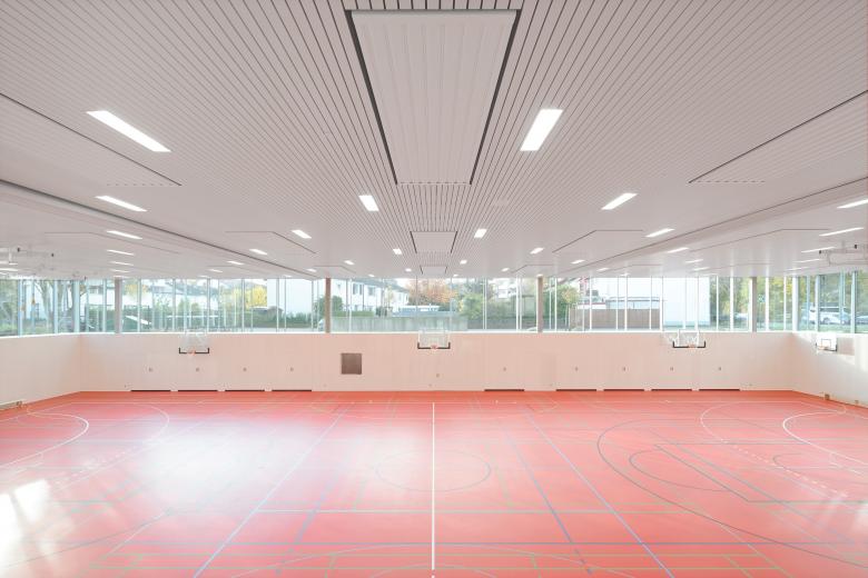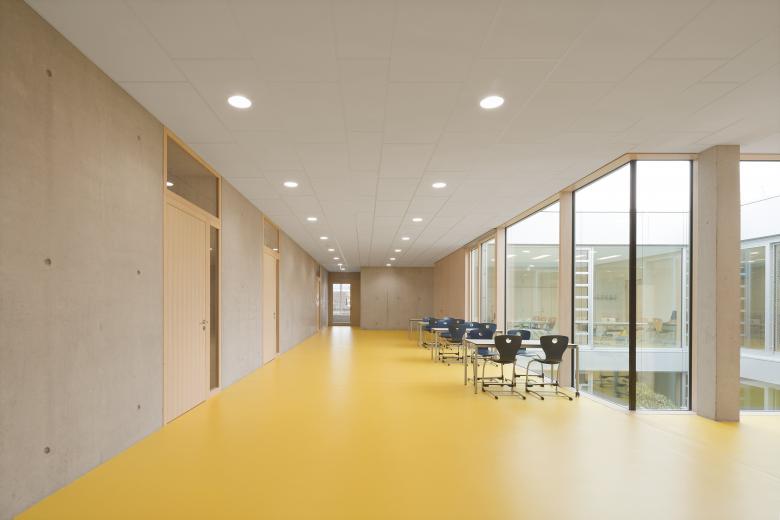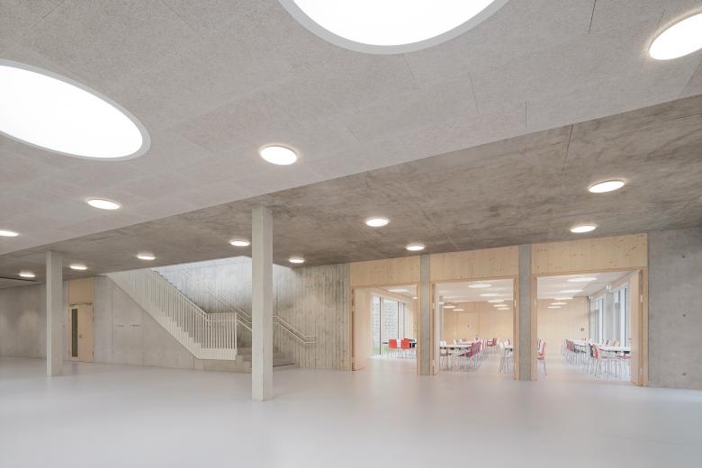 Das zwischen der Sporthalle und dem Saal des Kulturzentrums gelegene Foyer wird um die Forumsnutzungen nach Süden erweitert und bildet das neue Herz und den Haupteingang der Schule. Die Unterrichtsräume gruppieren sich in versetzt angeordneten Pavillions um jeweils eigene grüne Höfe. Die Anordnung der Schulbaukörper erzeugen im Zusammenspiel mit dem Rolf-Engelbrecht-Haus ein vielfältig nutzbares differenziertes Freiraumangebot.