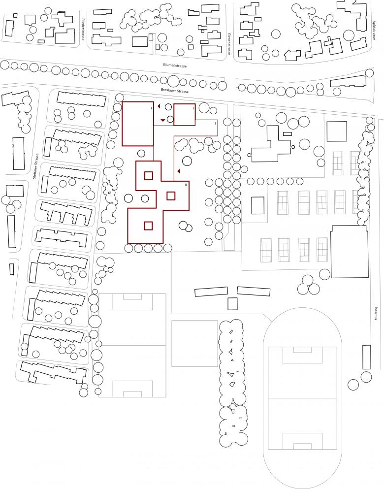Der Entwurf nimmt mit seiner Gliederung die Maßstäblichkeit und Körnung der Bestandsstruktur auf und ergänzt diese sorgsam um die Bausteine der Schule zu einem Gesamtensemble. An der Breslauer Straße wird das Ensemble um den Baukörper der Sporthalle im direkten Anschluss an das Bestandsfoyer des Kulturzentrums ergänzt. Gemeinsam mit dem Saal bildet sie so den baulichen Abschluss nach Norden und wertet die Eingangssituation des Kulturzentrum von der Breslauer Straße her auf.