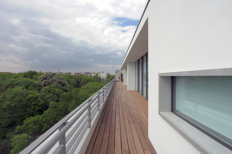 Das Dach des Vorderhauses wurde komplett abgetragen und durch ein freistehendes Penthouse mit umlaufender Dachterrasse ersetzt. Die moderne Form dieses Aufbaus tritt in einen spannungsvollen Dialog mit dem liebevoll restaurierten Altbau.