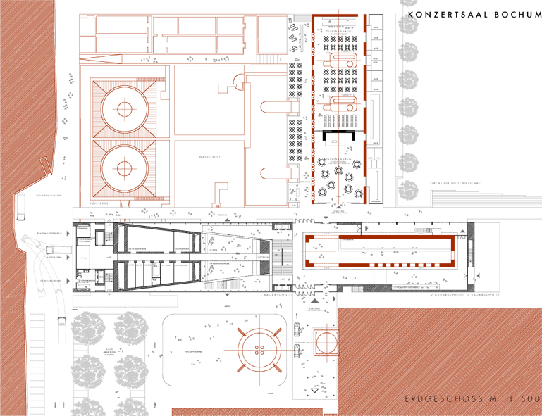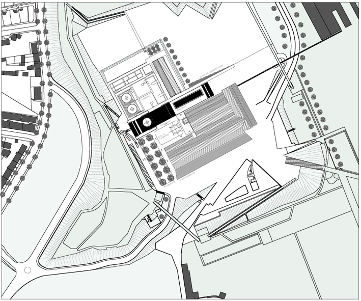 Wettbewerb, 1. PreisDie Charaktere der Industriebauten verdeutlichen, ihre Volumina integrieren und ihre Eigenheiten respektieren sowie die nördliche (Wasserwelt) und südliche (Platzgestaltung am Wasserturm) Ausdehnungsbegrenzung für einen Neubauentwurf: das sind die Parameter für die Entwicklung einer linearen Gebäudeidee als geometrischer Ansatz, die unter dem Oberbegriff einer Produktionsstrasse der Kultur zusammengefasst werden kann.