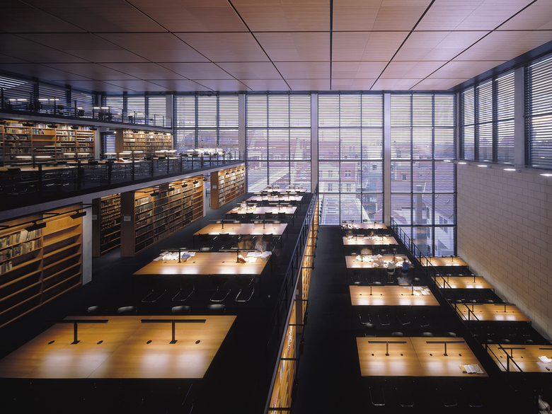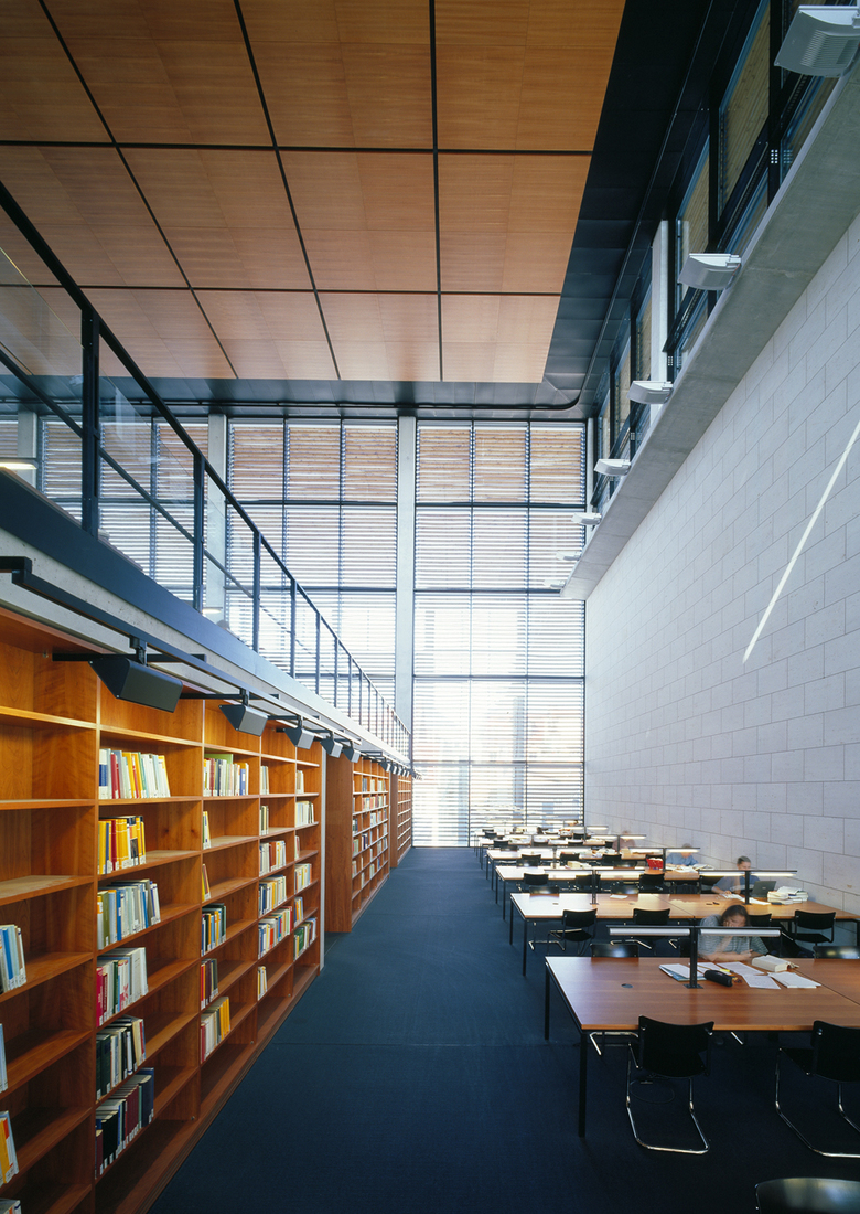 Die Ausformulierung der Terrassen innerhalb des Bibliothekskubus differenziert nach Westen das Volumen der Fakultätsräume zur mittelalterlichen Stadtstruktur, wodurch ein maßstäblicher Übergang geschaffen wird.
