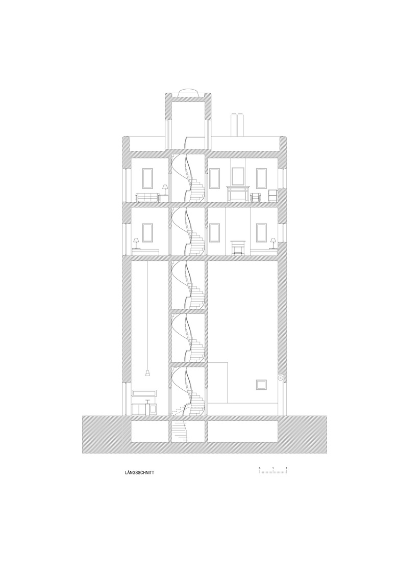 Der Getreidesiloturm ist 1963 entstanden. Es handelt sich um ein einfaches zweckbestimmtes Gebäude, dass mit mehreren Lagerhallen ein kleines Gebäude-Ensemble bildet. Die Grundidee zum Umbau des 20 Meter hohen Turmes ist ein „Adlerhorst“. Der Turm hat eine Grundfläche von 9,01 x 12,24 m und besteht aus einem 36,5 cm starkem Mauerwerk, welches durch 4 Stahlbetonringbalken gehalten wird. Die innen vorhandenen Holzkonstruktionen sowie das Dach wurden vollständig entfernt. Drei neue Stahlbetondecken im oberen Drittel des Turmes bilden die neuen Wohngeschosse und eine Dachterrasse. Die Erschließung vom Erdgeschoss bis zur Dachterrasse erfolgt in einem freigestellten neuen Sichtbetonkern mit Spindeltreppe und Aufzug.