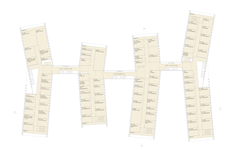 Eine die Massivbaukörper verbindende gläserne Passarelle ist Erschliessungs- und Kommunikationsraum zugleich – und schliesst die Wahrnehmung von Natur und Architektur auf diesem Weg bewusst mit ein.