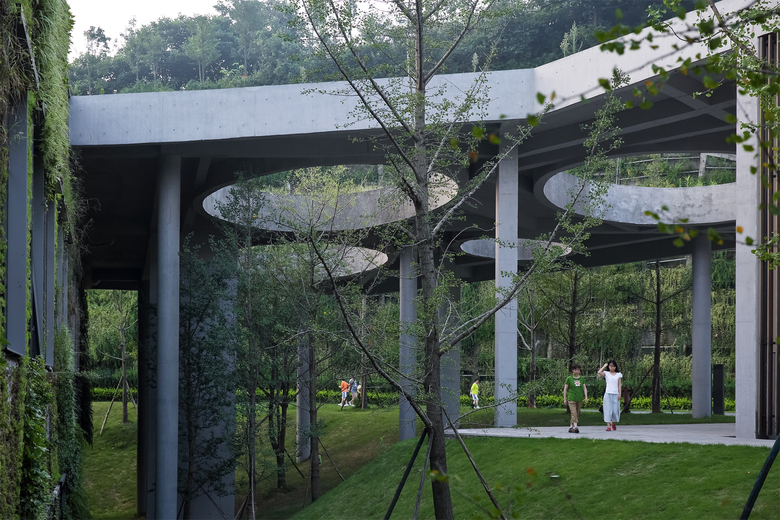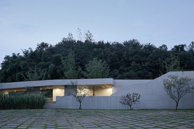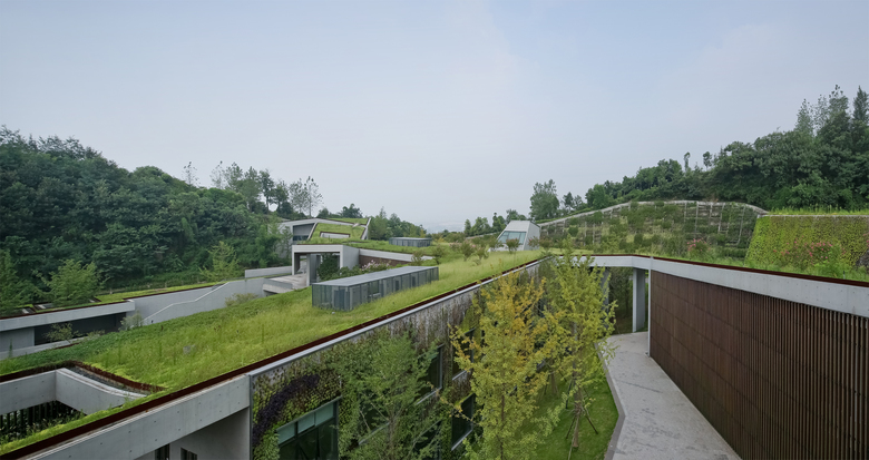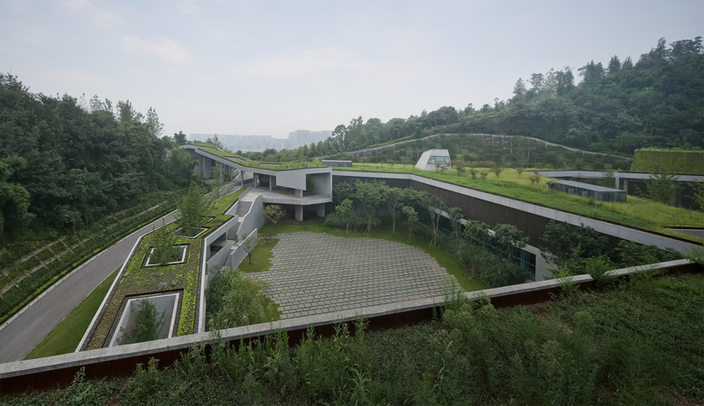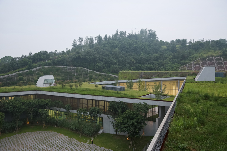 The community center is located in the mountains of Taoyuan Park in Chongqing. The starting point is attempting to merge new building outline with the existing wavy topography. Instead of building an “object” in the field, we hope to create an imagery of fusing architectural form and hilly landscape together. Green roof and green walls assist to blend the volume into its natural environment, and enhance the thermal co-efficiency of building envelope.