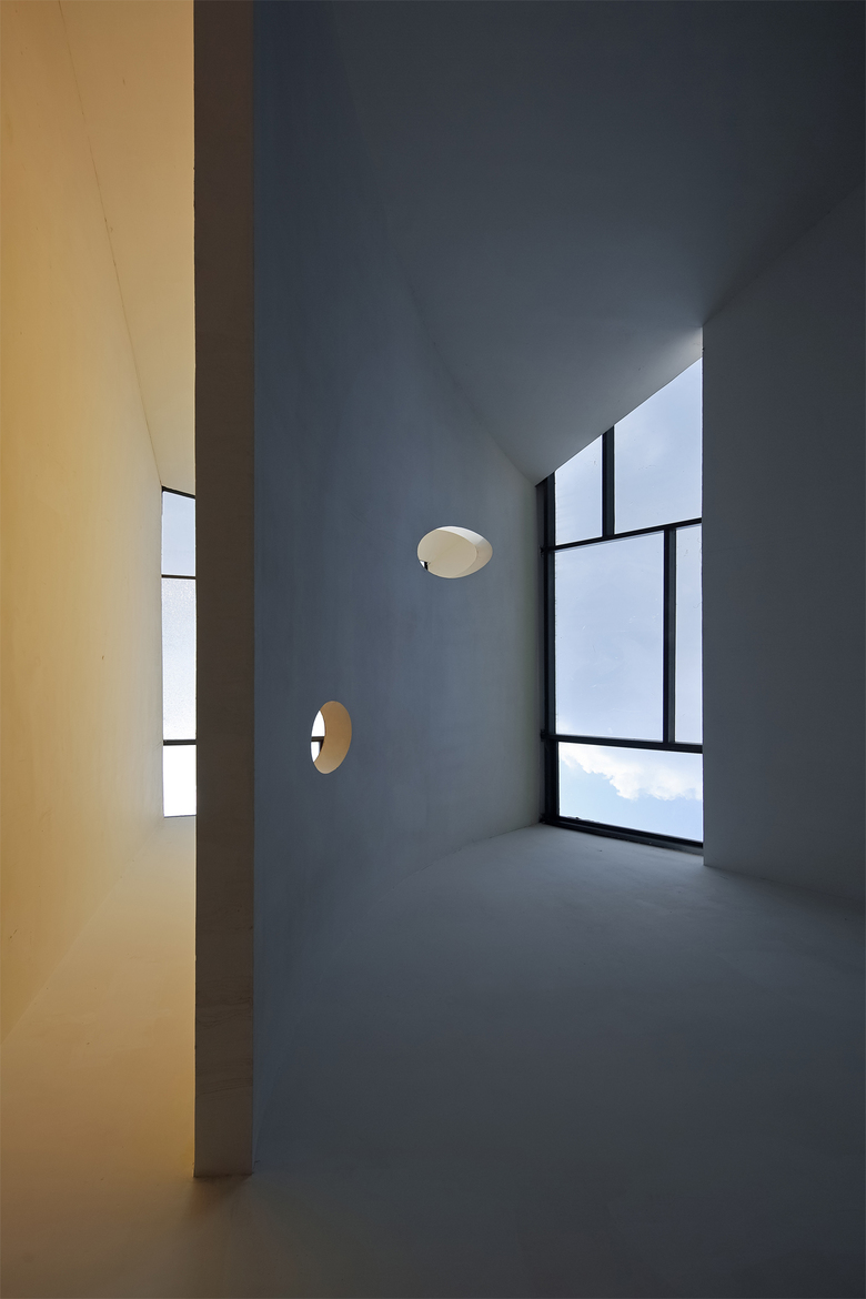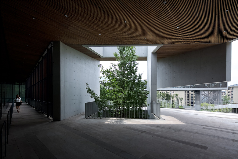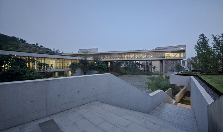 The three major buildings have their own atrium where large skylight introduces natural light into the deep space. Openings, windows, cantilevers and corridors blur the boundary between the interior and exterior of architecture. Thus, merging the whole space together with the sky, mountain, trees, sunlight and breeze can eventually create a lively co-existing relationship of artificial structure and natural landscape.