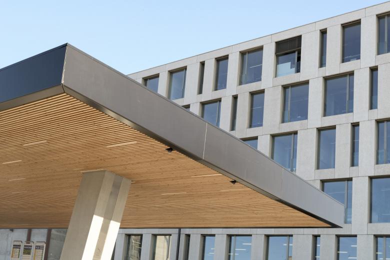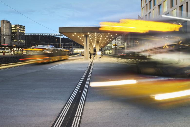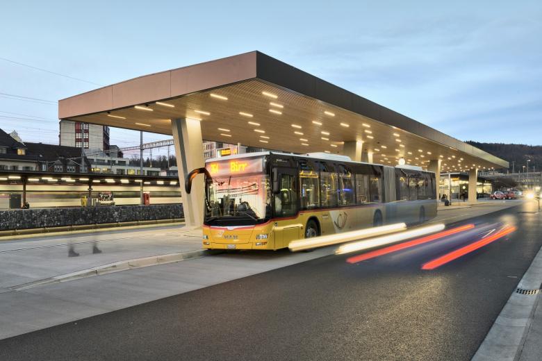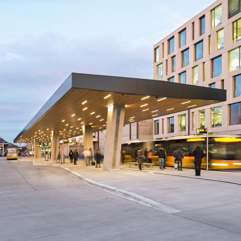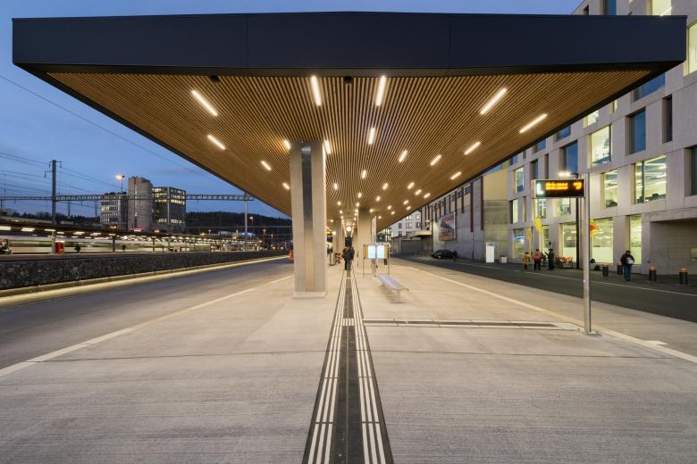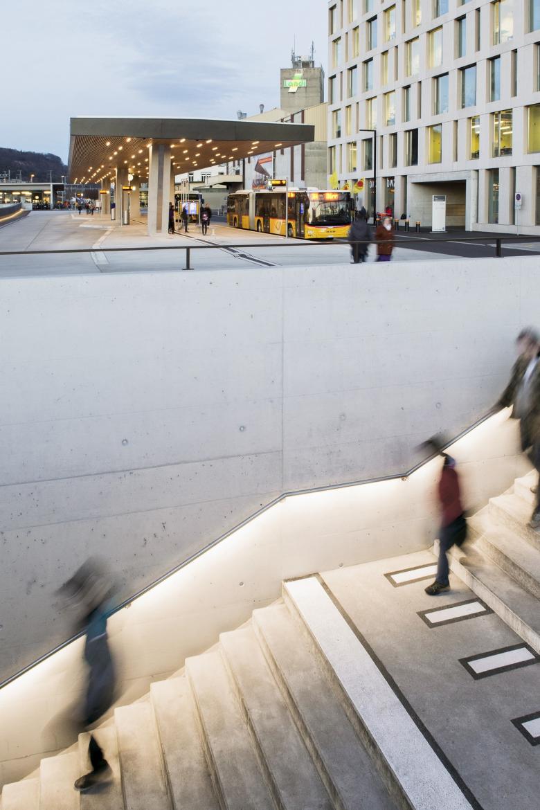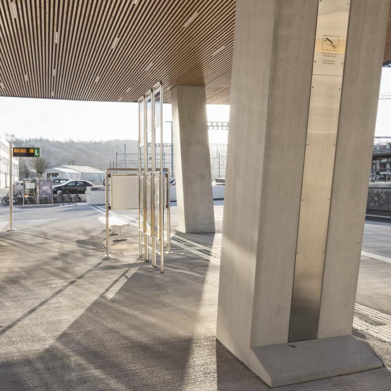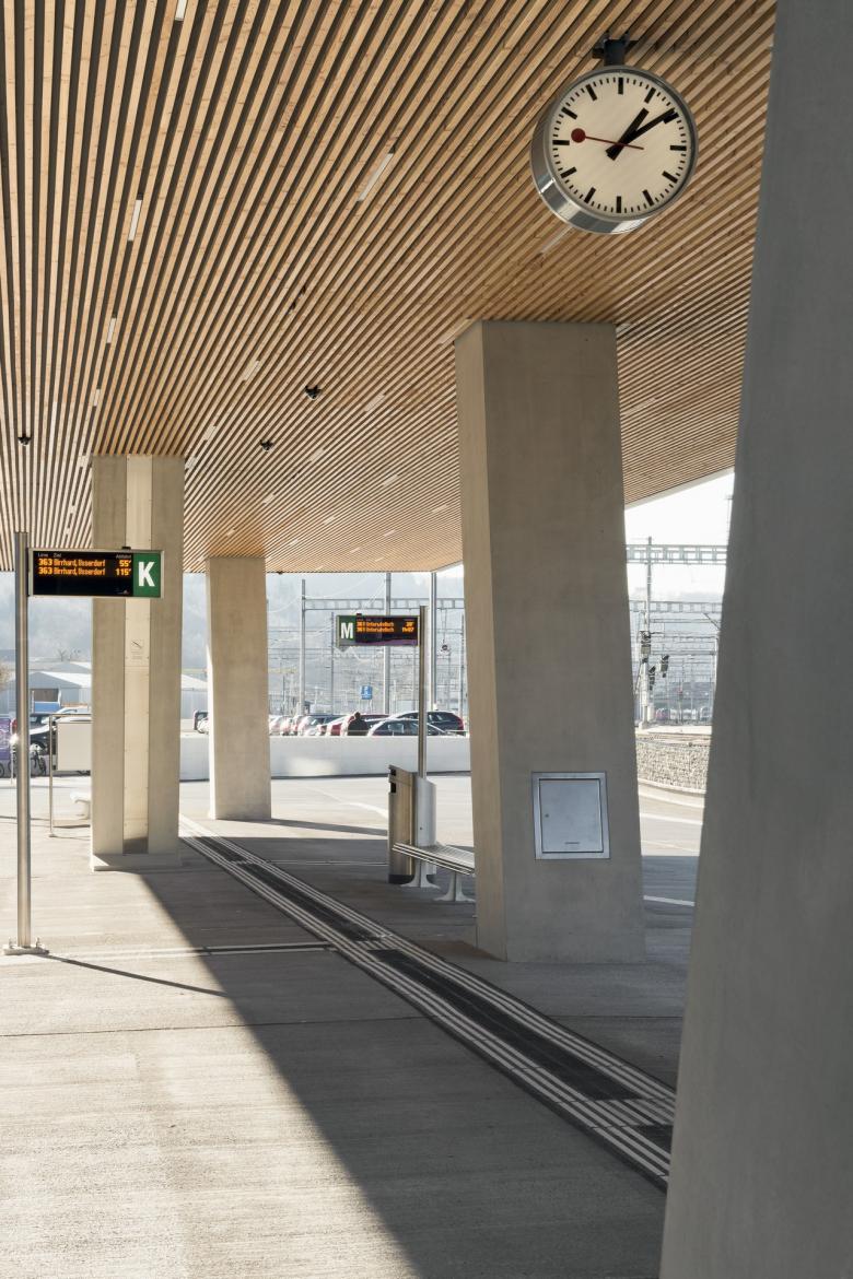 Der Busterminal hebt sich als hellgrauer Betonplatz von den angrenzenden Asphaltflächen ab und wird durch seine solide Materialisierung zur städtischen Insel, die den Reisenden am Bahnhof Brugg einen sicheren Ankunfts- und Umsteigeort bietet. Dabei ist der Perron in Form eines »Sägezahns« gestaltet und gibt seine dynamische Wirkung an sechs schräge Betonstützen weiter. Diese umschliessen in zwei Reihen eine axiale Bewegungszone für kommende und gehende Fahrgäste und werden wiederum beidseitig von Wartezonen flankiert. Das Perrondach zeigt sich als Gegenpol zum steinernen Boden und erhält mit einem Rahmen aus Stahlblech einen wohl proportionierten Abschluss. Als Untersicht zeigt sich eine feingliedrige Holzkonstruktion aus Douglasie, die von strahlenartigen Leuchten unterstützt wird und dem Busterminal eine warme und behagliche Atmosphäre verleiht.