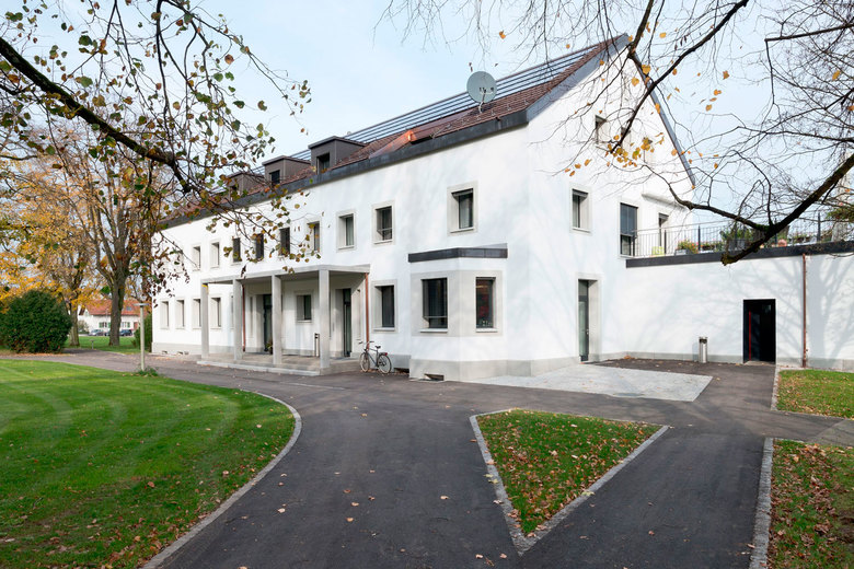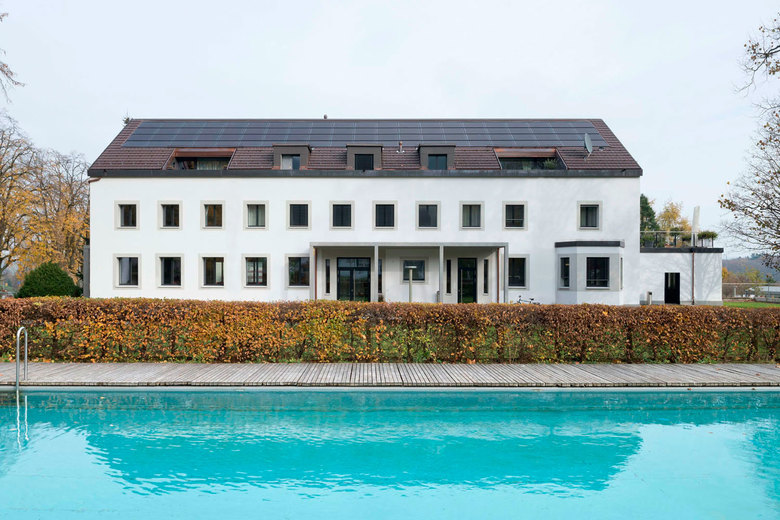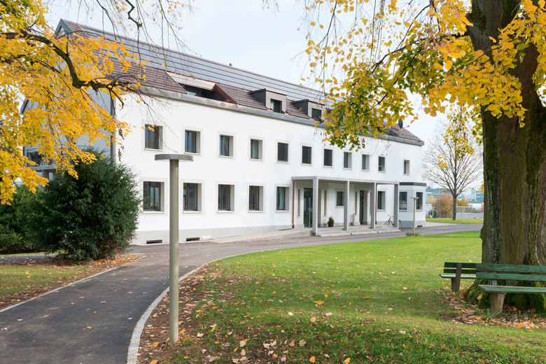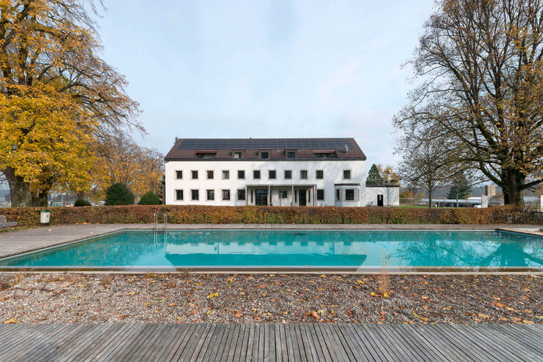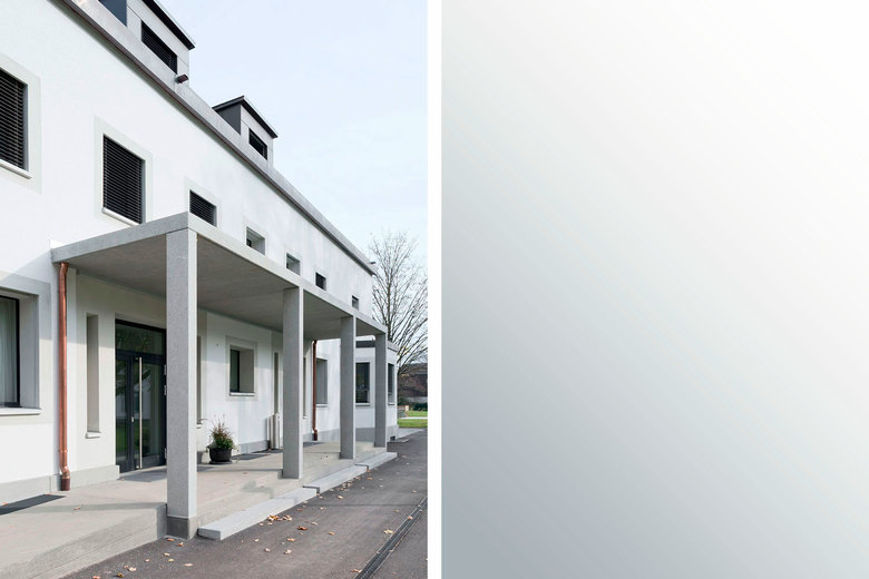 Mit der wärmetechnischen Sanierung wird der klar strukturierte und im Äusseren zurückhaltende Bau, vollständig gedämmt. Mit der Ausbildung von Fensterfriesen aus Feinputz in der grobkörnigen Fassade wird dem Gebäude ein Teil seiner Proportionalität zurückgegeben und ein Anklang an die einfache aber sorgfältige Architektur der 30er-Jahre hergestellt. Die dezente Farbigkeit der verwendeten Materialien findet einen feinen Kontrast in der Farbgebung der Putzflächen, deren differenzierte Struktur insbesondere im Streiflicht eine schöne Lebhaftigkeit entwickelt.