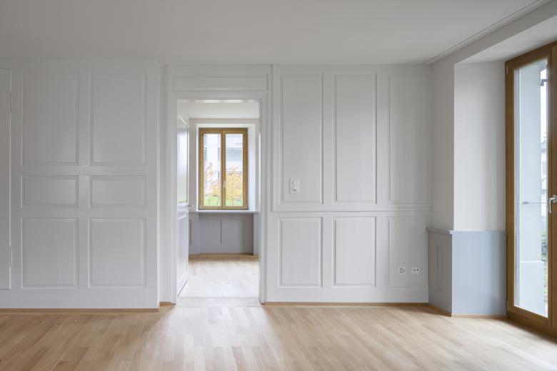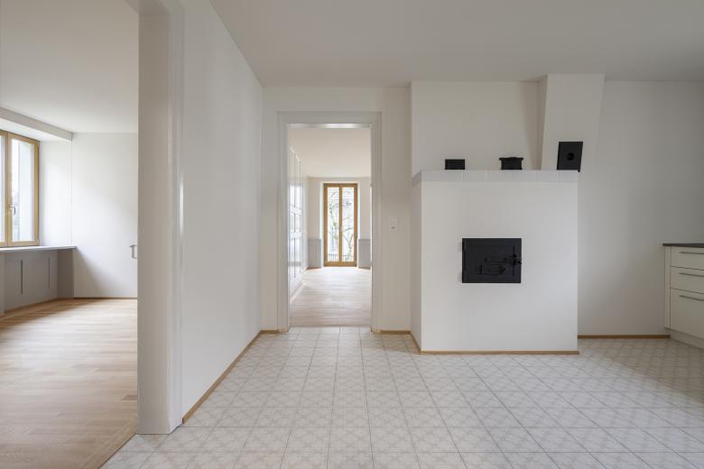 Das Haupthaus wurde in seinem äusseren Erscheinungsbild möglichst belassen und umfasst nun 2 Wohnungen sowie einen Hobbyraum unter dem Dach. Der nordseitige Holzschopf wurde rückgebaut und durch einen modernen Anbau ersetzt, welcher ausreichend Platz bietet für die vertikale Erschliessung, zwei Bäder und jeweils einen Aussensitzplatz pro Wohnung.