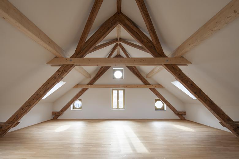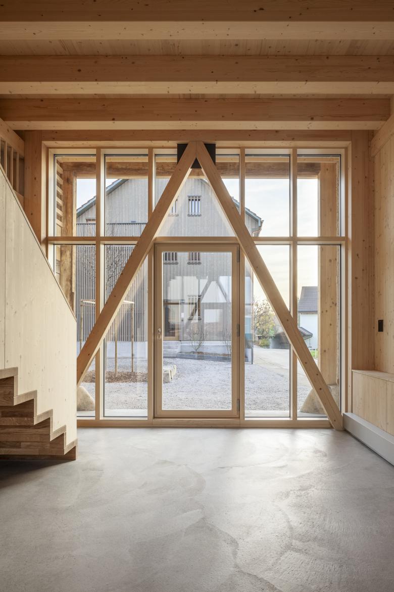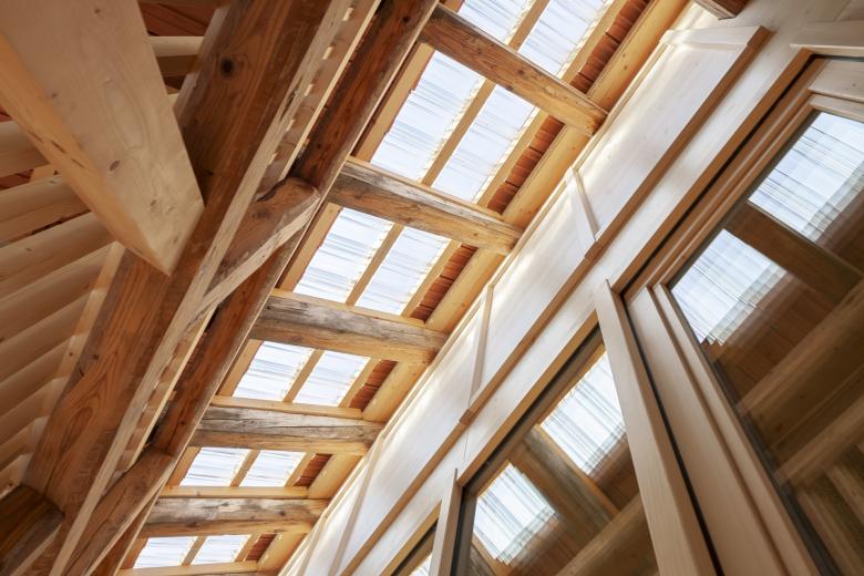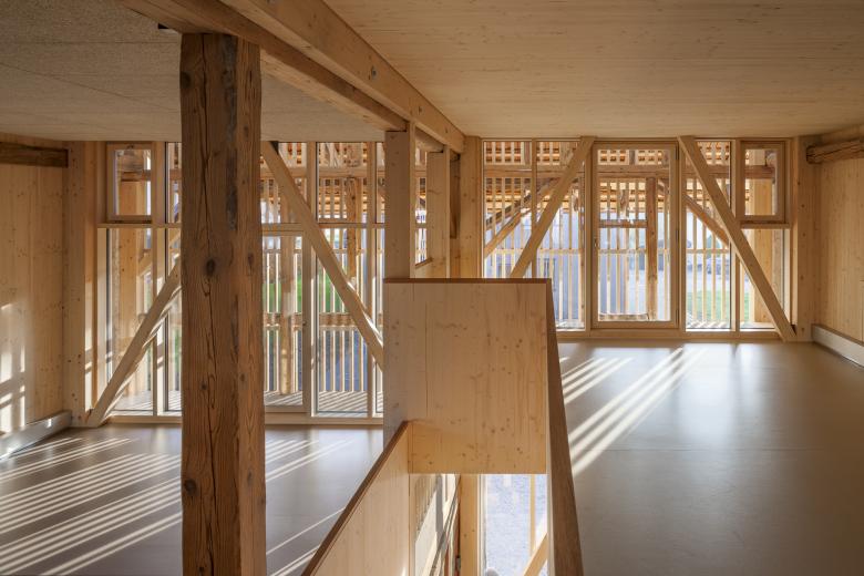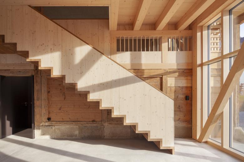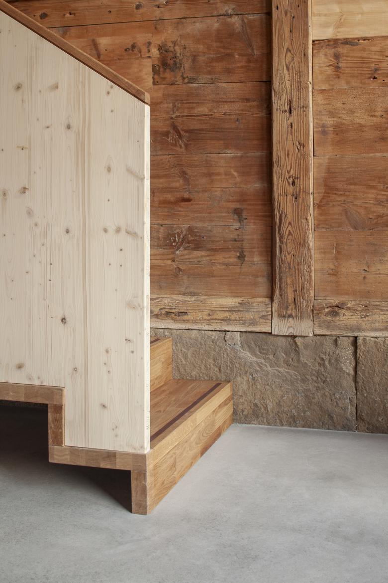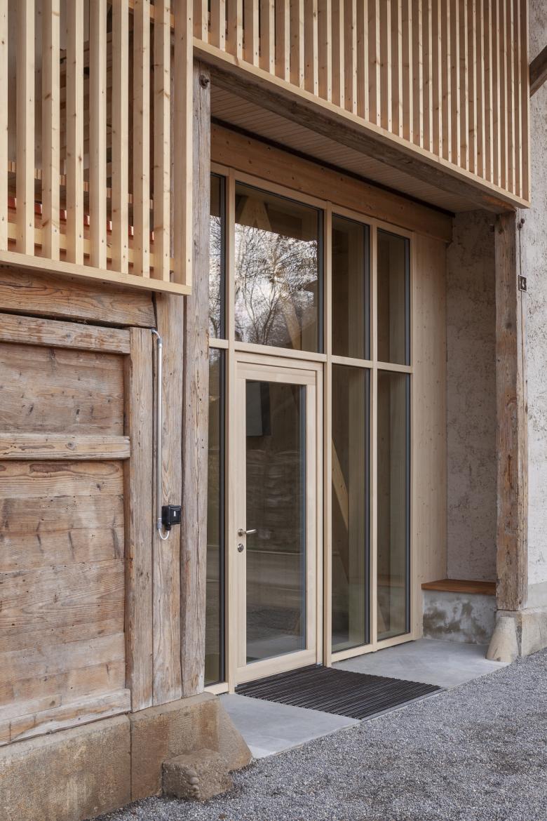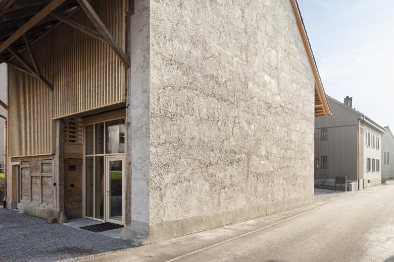Bei der Scheune konnten der Gebäudesockel sowie der Grossteil der inneren Struktur erhalten werden. Zur statischen Verstärkung wurden Holzbinderelemente eingebaut und neue Giebelwände aufgemauert, welche mit einem traditionellen, kalkhaltigen Putz versehen wurden. Das zweigeschossige, gedämmte Volumen innerhalb der Scheune wurde zu Büroräumen umgenutzt.