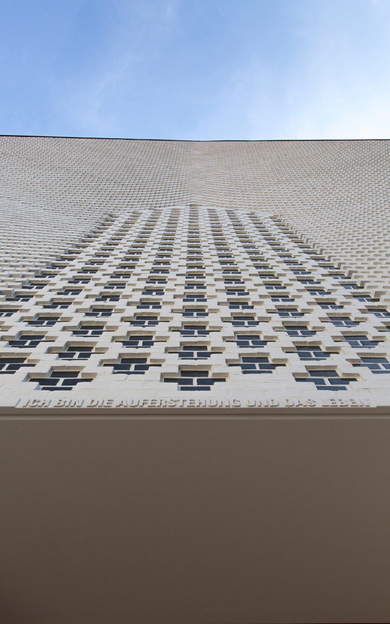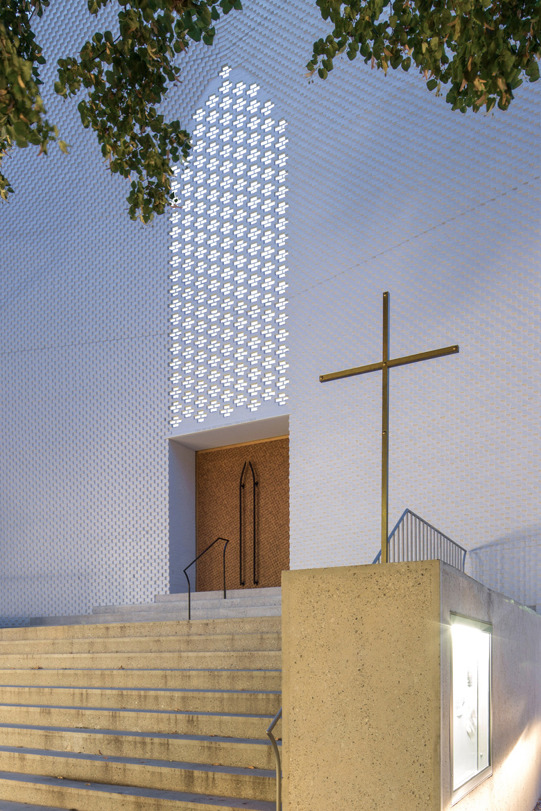 Weiß geschlämmte Backsteine, die mit gläsernern Elementen durchsetzt sind treppen sich nach innen ab und bilden so das Portalgewand. Die Steine der innen liegenden Stirnwand bilden durch Vertiefungen und Auslassungen ein nach innen wie aussen lichtdurchlässiges Ornament, das den Blick des Besuchers einfängt.