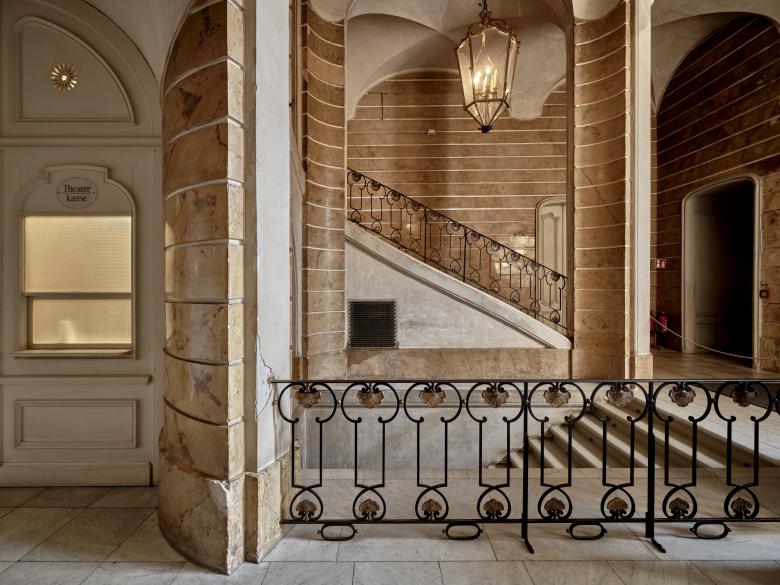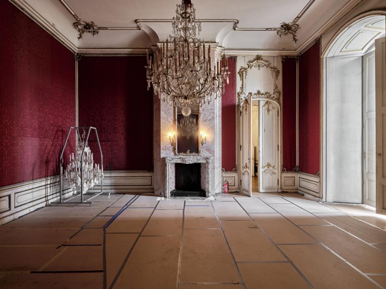 Der respektvolle Umgang mit all diesen Überlagerungen und Zeitschichten spielt eine große Rolle in der aktuellen Projektbearbeitung. Der Neue Besucherempfang wird in den sehr hochwertig ausgestatteten Räumen der Unteren Roten Kammern angeordnet. Die neuen Einbauten für diese Funktionen werden freistehend und reversibel in der Mitte der Räume mit großzügigem Abstand zu den Wänden und mit Bezug auf die Raumachsen angeordnet. Zum Schutz der hochwertigen Wandoberflächen sind hier bauliche Absperrungen vorgesehen, die gestalterisch dezent in die Räume integriert werden.