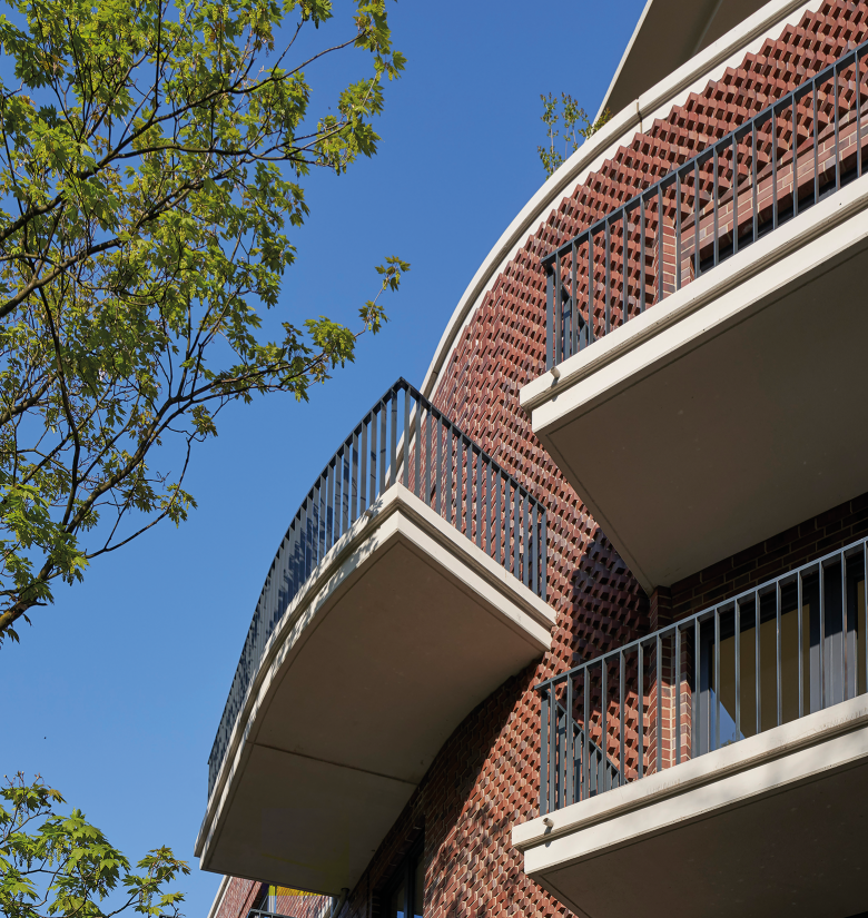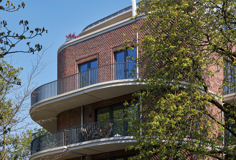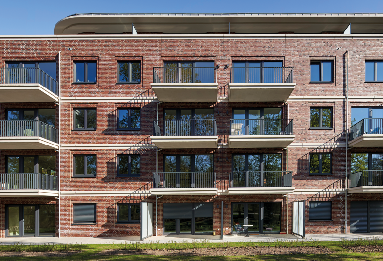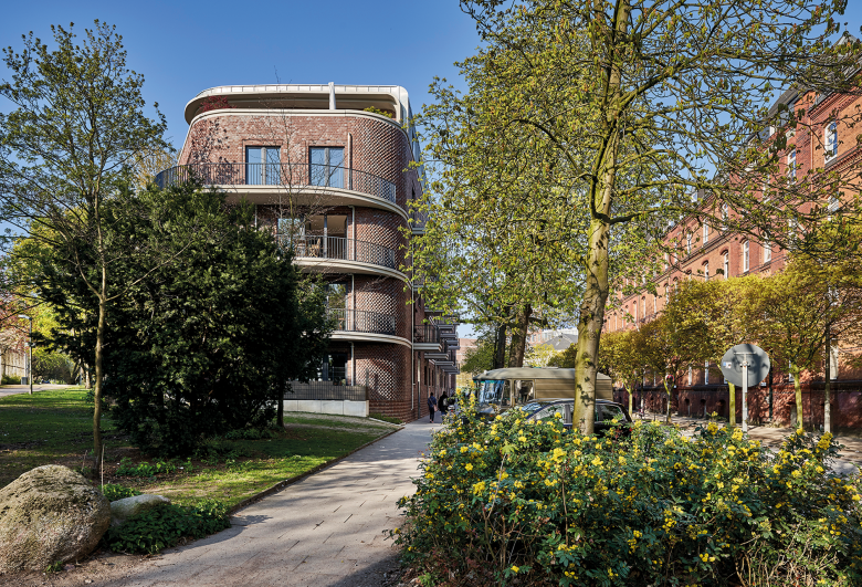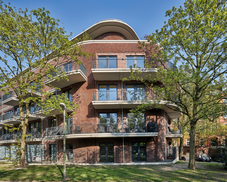 In accordance with the Hamburg tradition, red brick is used as a building material and from this the architectural cubature is developed, as is the case with Fritz Höger's Chile House. The interplay of the interlaced, structured clinker components, the prefabricated balconies and the floating roof shape the figure of the house. Along the street, the materiality is shaped by a parallel stretcher bond, while towards the Elbpark a structured surface is created through offset walling, which shows a subtly changing shadow play depending on the course of the day and the incidence of light.
