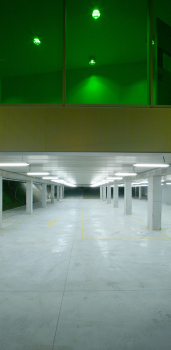 1. The lower space. The container is suspended above a new depression in the terrain which creates a parking space capable of putting on various activities, according to the season and the time of the day.