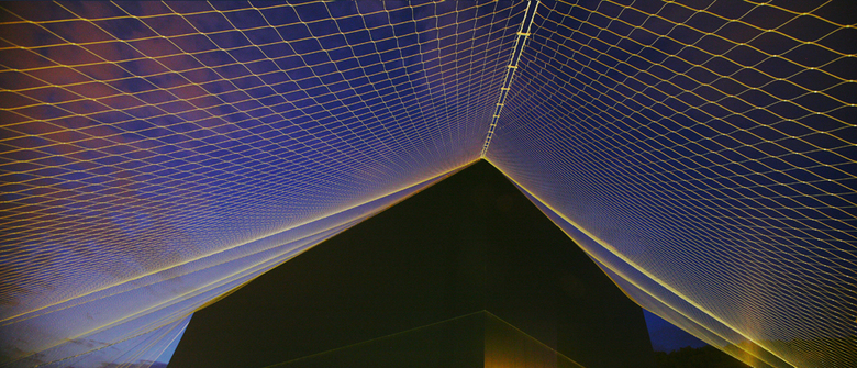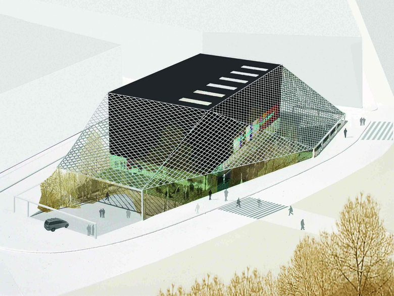 2. The surrounding space. The container is surrounded by a facetted geometry comprising a taut metal net that creates a series of green spaces equipped to put on temporary outdoor exhibitions, as well as a range of social events