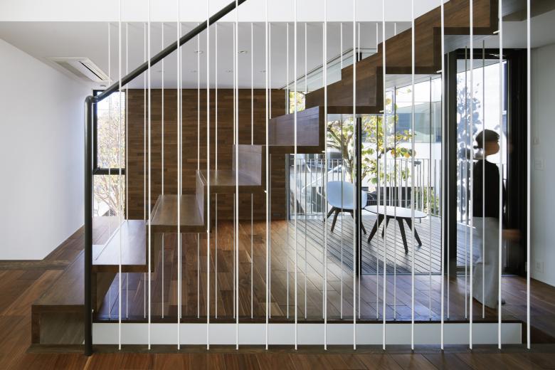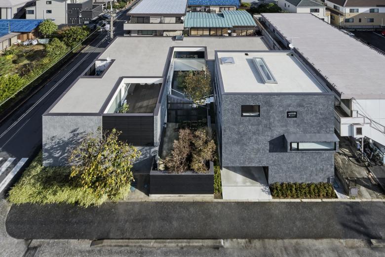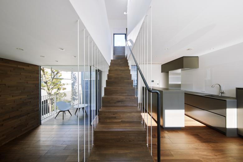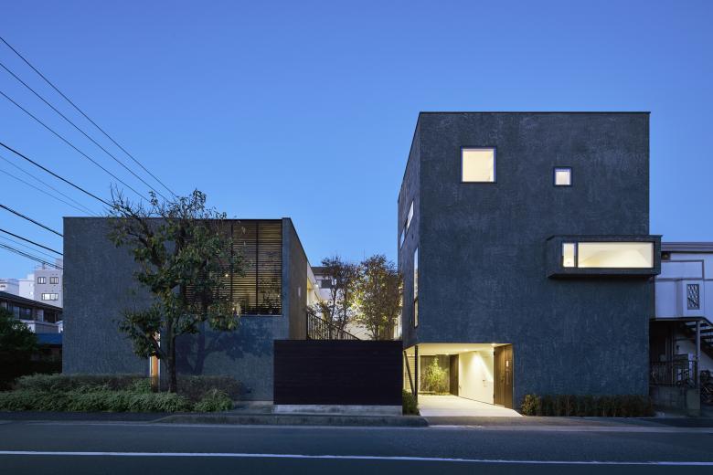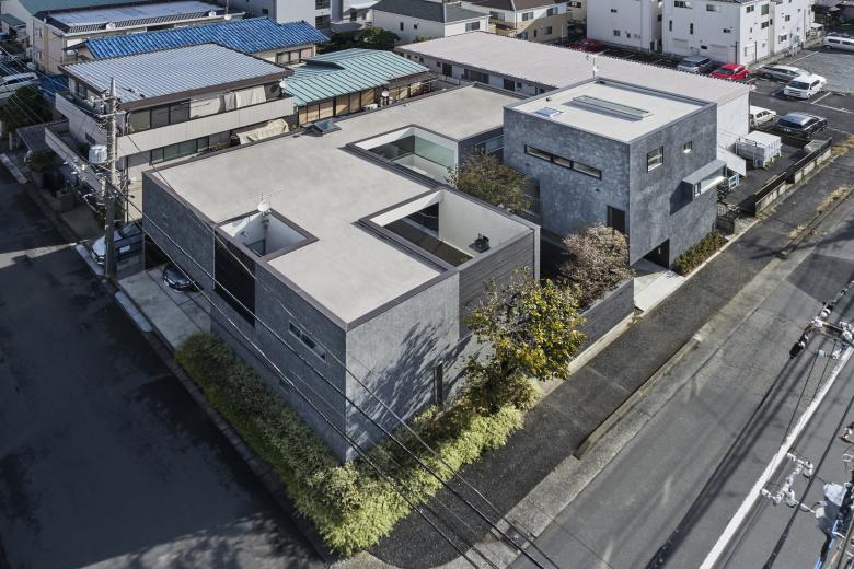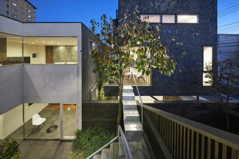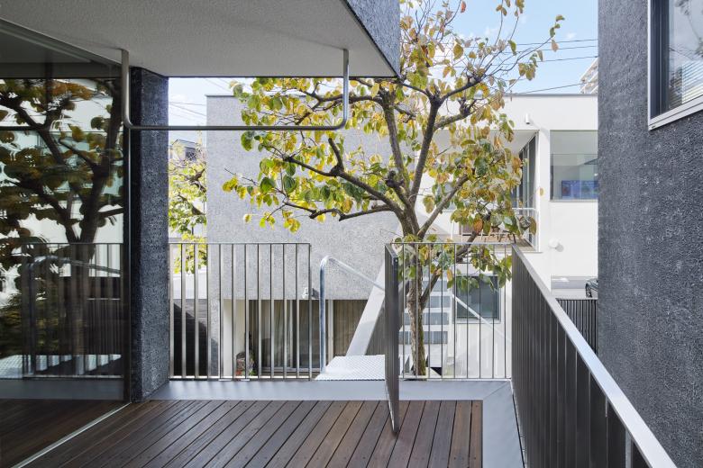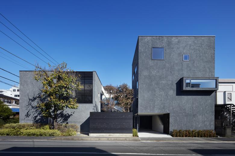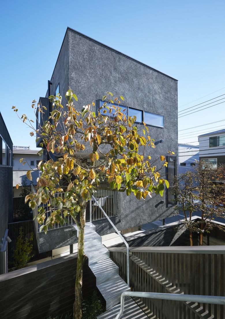 5年の歳月を経て2つの家をつくった。 1つ目の家USは5年前に竣工したご両親の家でご主人のお母さんとの2世帯住宅だった。 2つ目の家USⅡはご実家の隣地につくられたご長男家族のための住まいである。敷地は18坪しかないため、建蔽率いっぱいの3階のボリュームを道路側に寄せて配置した。矩形平面の中央に直階段を配置した単純な構成であるが、階段により分節された2つの空間の床レベルを40cmずらしている。1階と3階は細かく空間が仕切られているが、2階のリビング・ダイニングは大きな一つの空間となっている。中央の階段はスチールのロッドで吊られていて空間をやわらかく分節している。 2階部分の北側に、柿の木に隣接するテラスをつくった。このテラスから柿の木の向こう側にある隣地のご両親の家のテラスやダイニングに視線が通り、お互いの気配が感じられる距離感を生み出している。また外部階段により2つの家の2階のテラスが結ばれ、2階レベルで2つの家を直接行き来できるようになっている。 家族の長い記憶が刻まれた柿の木のまわりに4世代にわたるご家族が寄り添うように住むために、外部空間のネットワークが生まれるように考えられた住宅である。