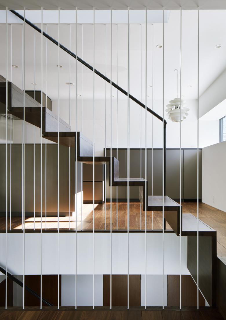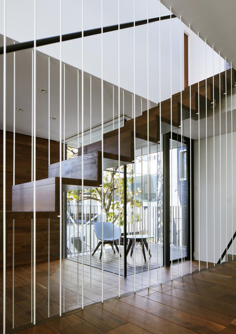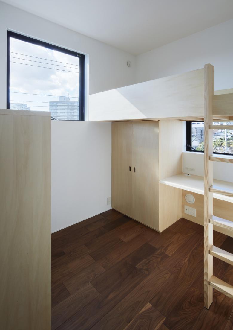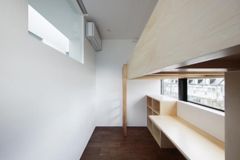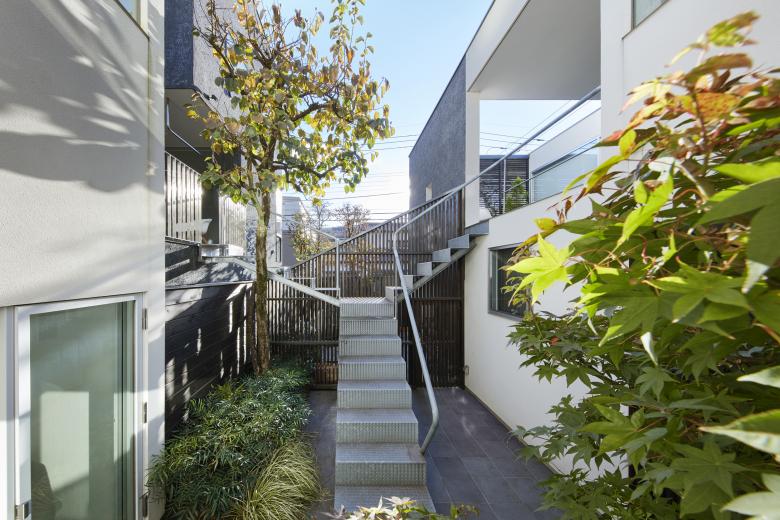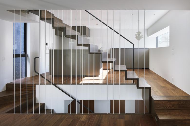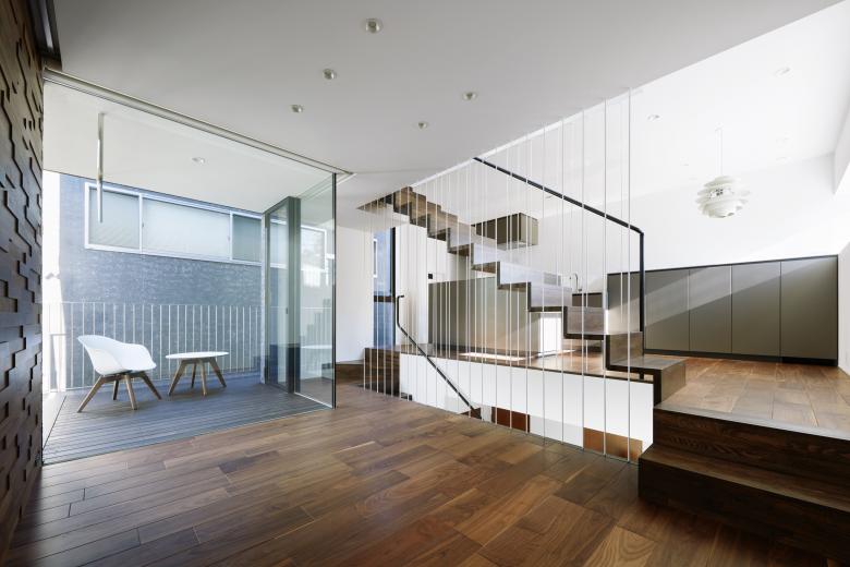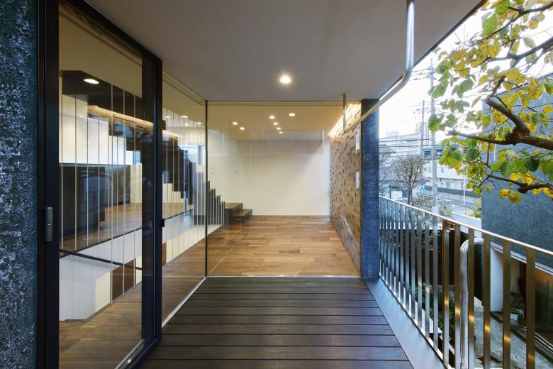 5年の歳月を経て2つの家をつくった。 1つ目の家USは5年前に竣工したご両親の家でご主人のお母さんとの2世帯住宅だった。 2つ目の家USⅡはご実家の隣地につくられたご長男家族のための住まいである。敷地は18坪しかないため、建蔽率いっぱいの3階のボリュームを道路側に寄せて配置した。矩形平面の中央に直階段を配置した単純な構成であるが、階段により分節された2つの空間の床レベルを40cmずらしている。1階と3階は細かく空間が仕切られているが、2階のリビング・ダイニングは大きな一つの空間となっている。中央の階段はスチールのロッドで吊られていて空間をやわらかく分節している。 2階部分の北側に、柿の木に隣接するテラスをつくった。このテラスから柿の木の向こう側にある隣地のご両親の家のテラスやダイニングに視線が通り、お互いの気配が感じられる距離感を生み出している。また外部階段により2つの家の2階のテラスが結ばれ、2階レベルで2つの家を直接行き来できるようになっている。 家族の長い記憶が刻まれた柿の木のまわりに4世代にわたるご家族が寄り添うように住むために、外部空間のネットワークが生まれるように考えられた住宅である。