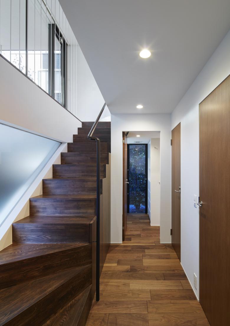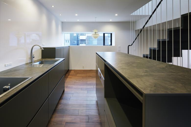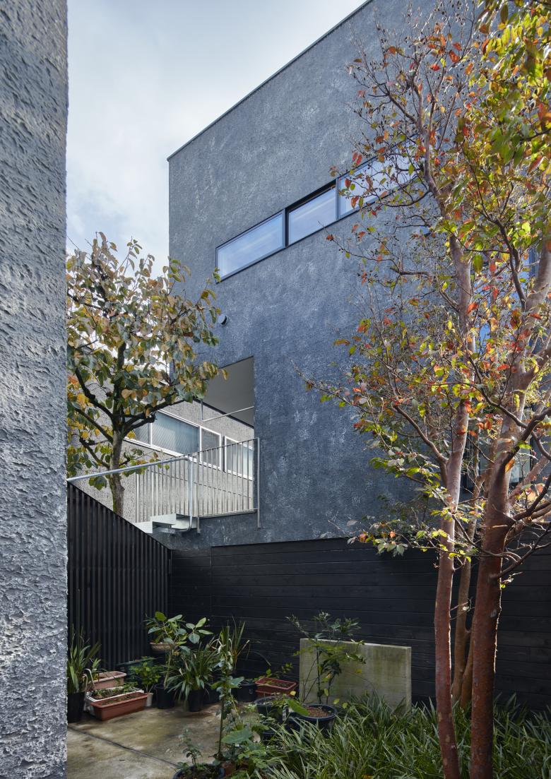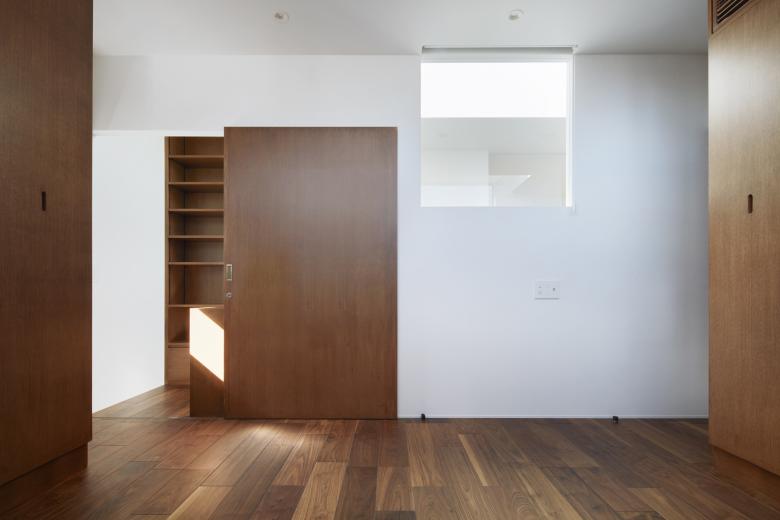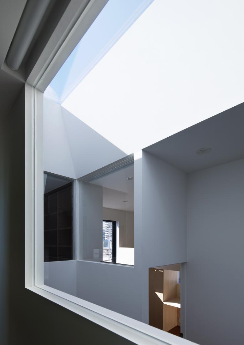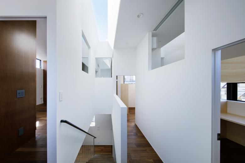 5年の歳月を経て2つの家をつくった。 1つ目の家USは5年前に竣工したご両親の家でご主人のお母さんとの2世帯住宅だった。 2つ目の家USⅡはご実家の隣地につくられたご長男家族のための住まいである。敷地は18坪しかないため、建蔽率いっぱいの3階のボリュームを道路側に寄せて配置した。矩形平面の中央に直階段を配置した単純な構成であるが、階段により分節された2つの空間の床レベルを40cmずらしている。1階と3階は細かく空間が仕切られているが、2階のリビング・ダイニングは大きな一つの空間となっている。中央の階段はスチールのロッドで吊られていて空間をやわらかく分節している。 2階部分の北側に、柿の木に隣接するテラスをつくった。このテラスから柿の木の向こう側にある隣地のご両親の家のテラスやダイニングに視線が通り、お互いの気配が感じられる距離感を生み出している。また外部階段により2つの家の2階のテラスが結ばれ、2階レベルで2つの家を直接行き来できるようになっている。 家族の長い記憶が刻まれた柿の木のまわりに4世代にわたるご家族が寄り添うように住むために、外部空間のネットワークが生まれるように考えられた住宅である。