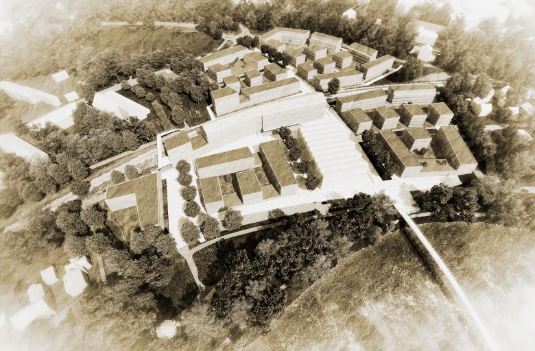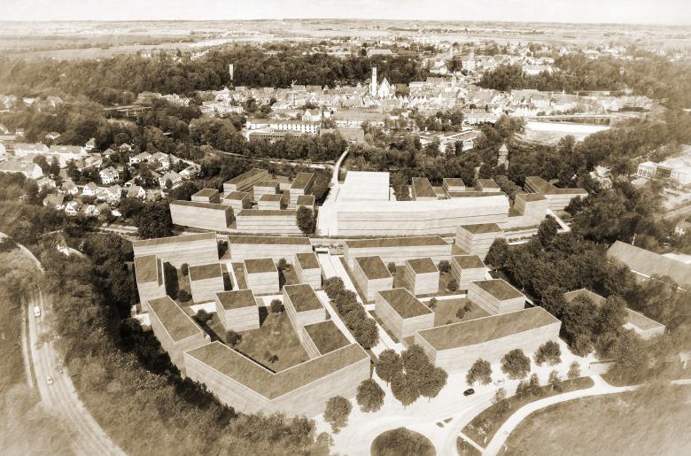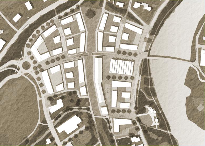 Fluss, Bahnlinie, Topographie, Aus- und Durchblicke und erhaltenswerte Bestandsbauten sind wesentliche Randbedingungen für den städtebaulichen Entwurf.