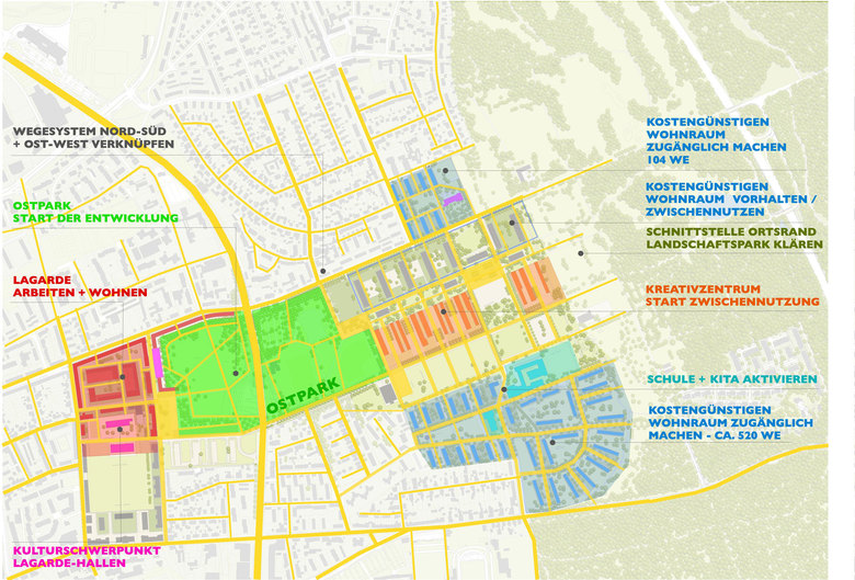 Initialprojekte, wie der neue Ostpark als Brückenschlag über den Berliner Ring, das Kreativzentrum im Bereich der Artilleriekaserne und die Kulturhallen auf dem Lagardeareal, sollen den Anstoß für künftige Entwicklungen geben.