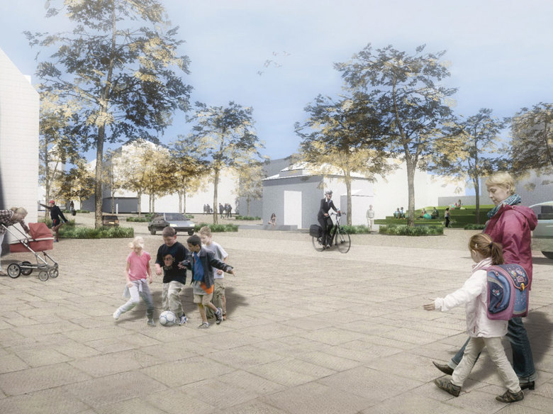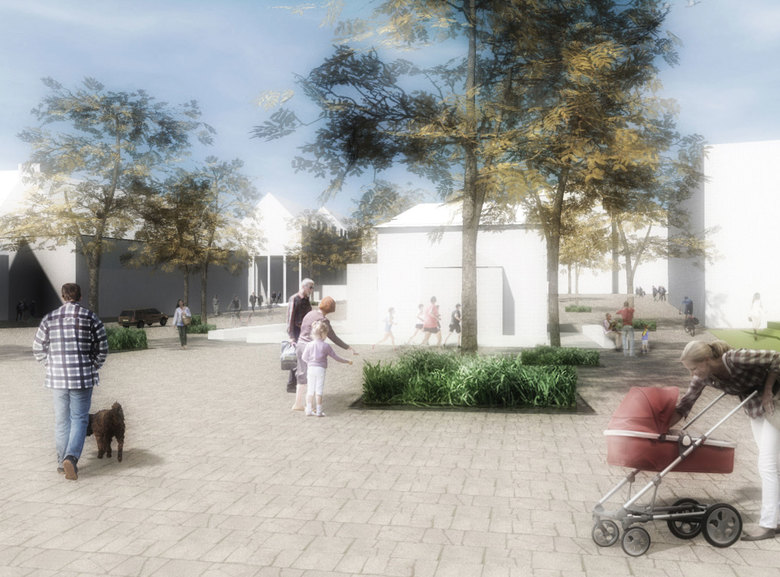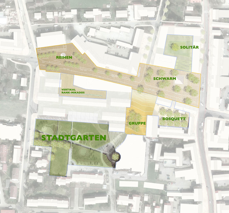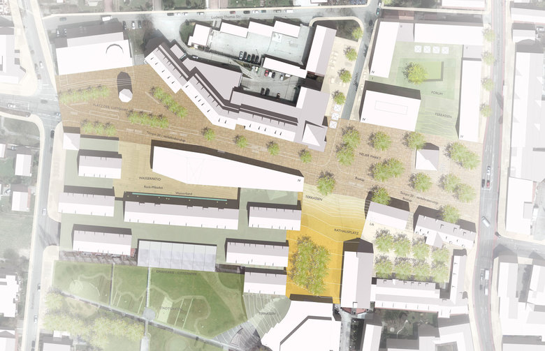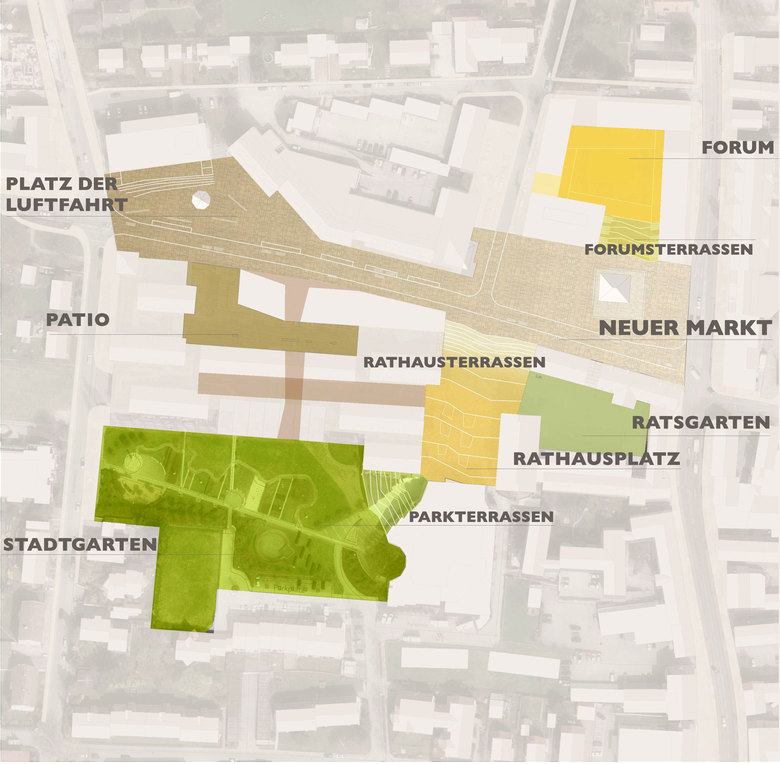 Die Weiterentwicklung des Wettbewerbskonzept zur neuen Mitte konzentriert sich auf die Attraktivierung des öffentlichen Raumes aus der Freiflächengestaltung heraus, unabhängig von den Anliegergrundstücken.