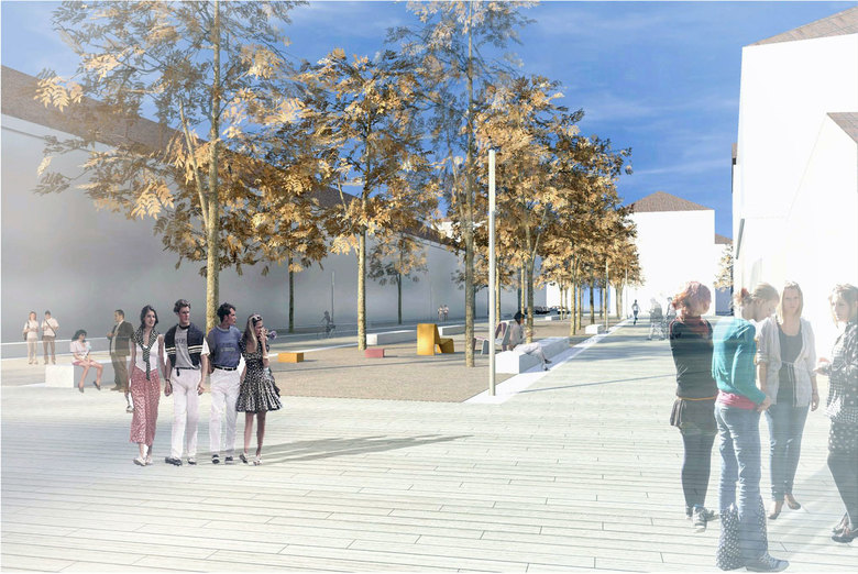 Die Ausformulierung zum Platz geschieht über einen Flächenbelag der durch breite Gliederungsstreifen in Bänder unterteilt wird. In den Bändern, aber auch über die Bänder hinweg, finden sich Flächen aus oberflächenstrukturiertem Beton sowie solche mit wassergebundener Decke. Eines der Bänder kann den noch anfallenden wenigen Fahrverkehr aufnehmen. Die übrigen sind dem Aufenthalt der Schüler aber auch Passanten vorbehalten. Die Bestandsbäume werden integriert und durch Neupflanzungen ergänzt.