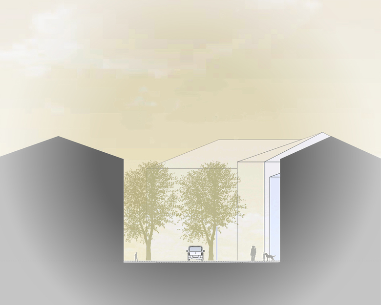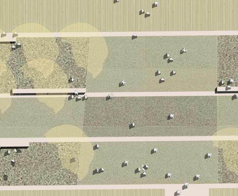 Die Straßen erhalten eine Mittelrinne, die den Raum besser zusammenfasst als ein gewöhnliches Dachprofil. Auf der Südseite werden Senkrechtstellplätze in Gruppen angeordnet. Die Busse halten vor oder nach dem Campusbereich. Zur Beleuchtung werden sowohl im Campus- als auch im Strassenbereich zurückhaltende Leuchtstelen platziert.