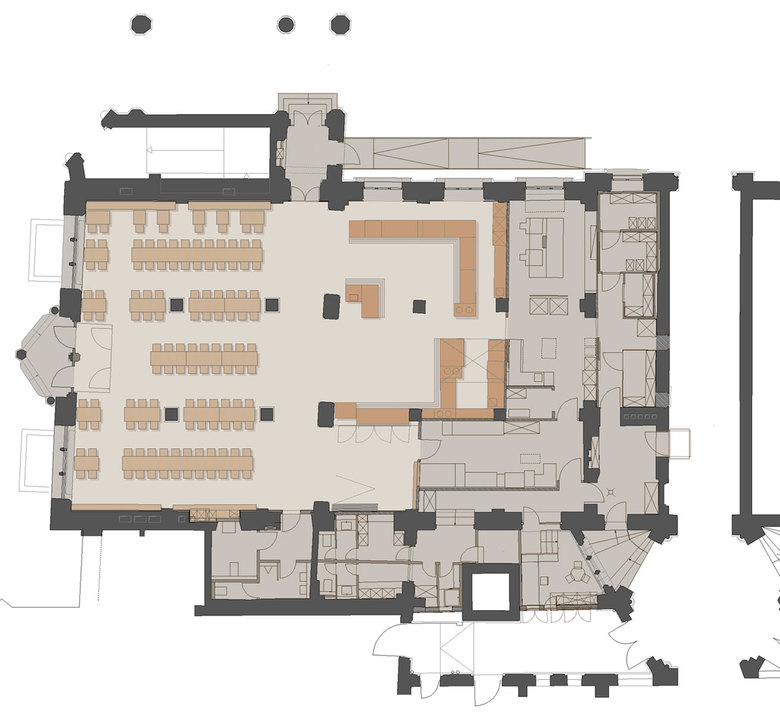Sowohl im linearen Belichtungskonzept, der Möblierung mit langen Tischen als auch der einheitlichen Materialwahl wird die Idee der Verzahnung des Gastraums mit dem Free-Flow-Bereich verfolgt und die dreischiffige Gesamtwirkung des Gewölberaumes betont.