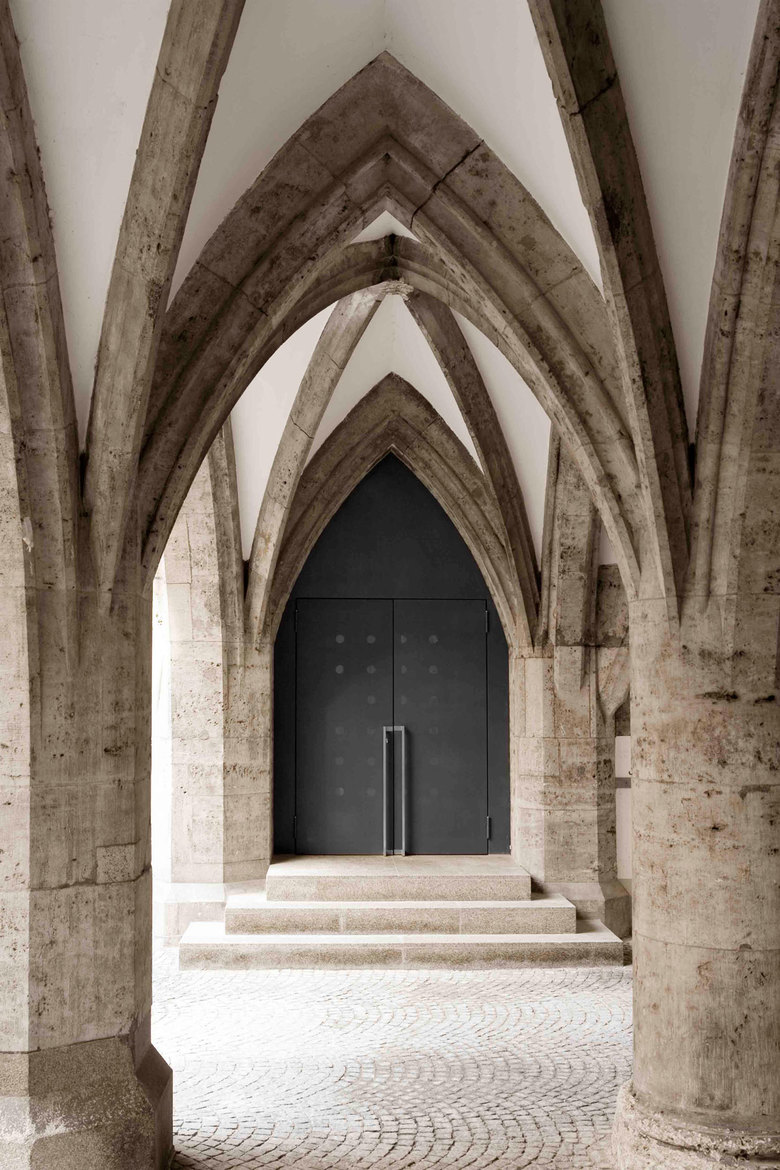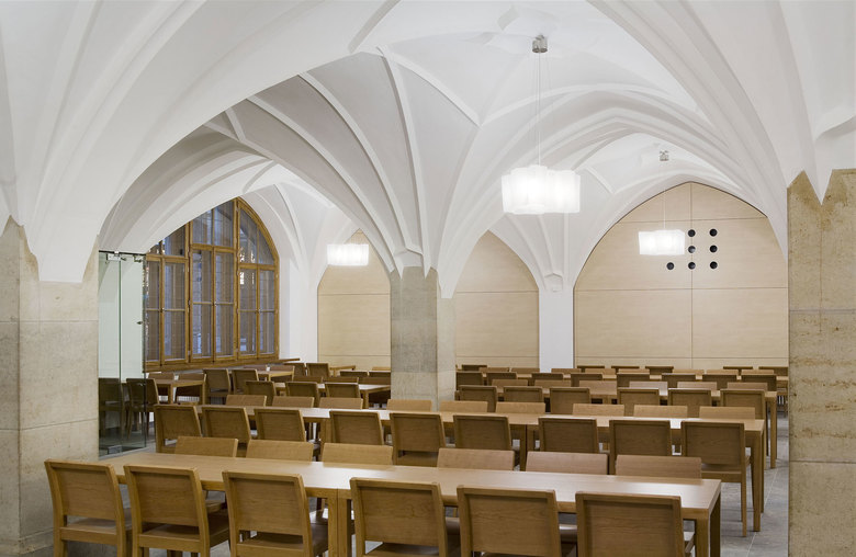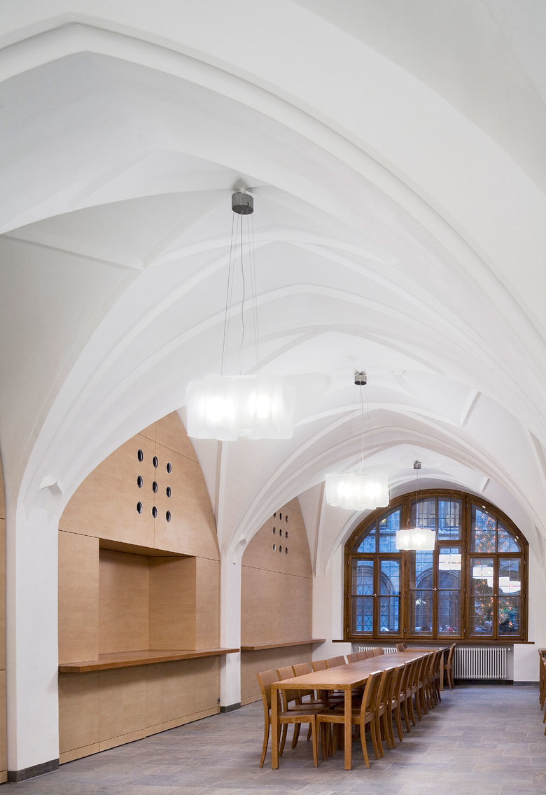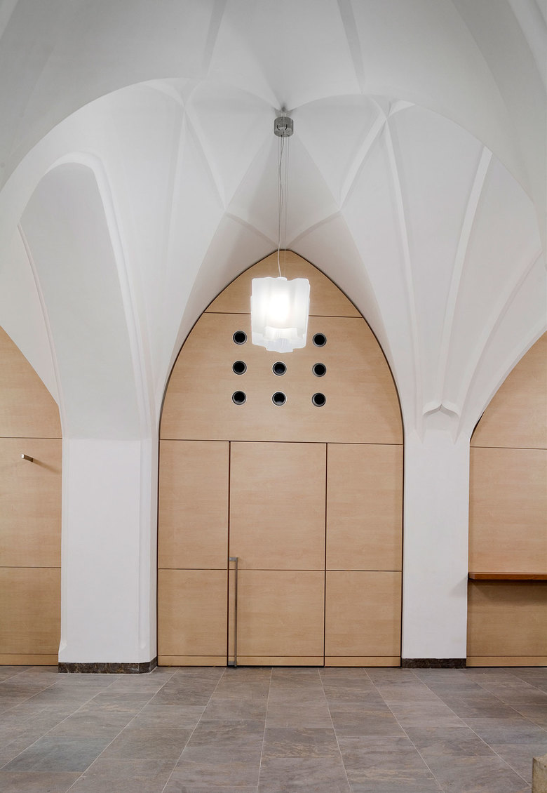 Der durchgehende, Wandbelag aus Akustikpaneelen in heller Holzoptik, verbessert die Raumakustik und nimmt notwendige Einbauten wie Sitzbank, Espressobar mit Stehtheke usw. auf und bildet gemeinsam mit der Möblierung und den unveränderten steinernen Gewölbebögen und Pfeilern ein interessantes Zusammenspiel.