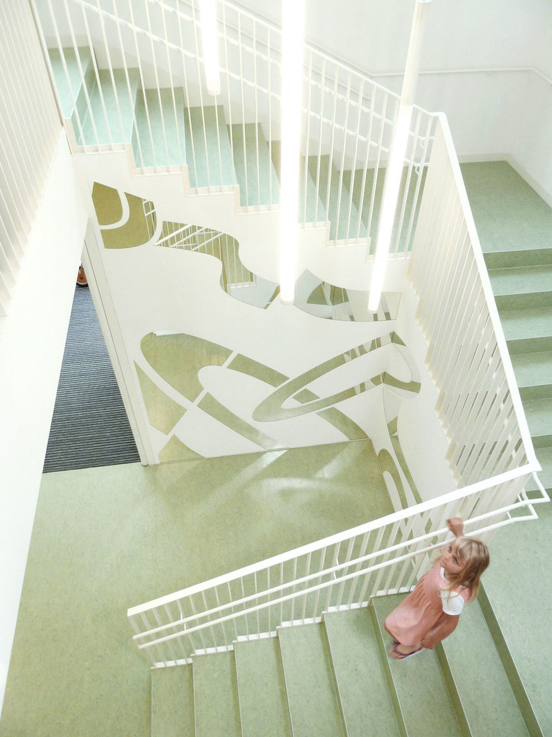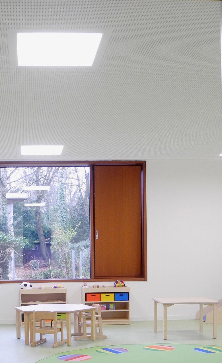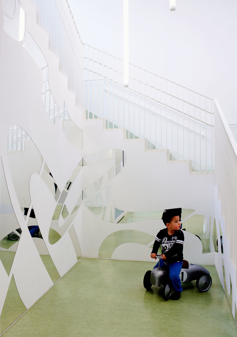 Die Grundrissorganisation mit Gruppenräumen im Süden und Nebenräumen im Norden folgt den funktionalen Erfordernissen. Die als Spielflure ausgelegten Erschließungswege im Gebäude erlauben Ein- und Durchblicke und tragen maßgeblich zur Atmosphäre des Gebäudes bei. Eine kleine zweigeschossige Treppenhalle im Eingangsbereich öffnet durch das von oben über ein großes Panoramafenster einfallende Licht den Blick ins Obergeschoss. Attraktion ist hier die ornamentale Spiegelwandinstallation der Künstlerin Gesine Braun, die mit ihren vielfachen Windungen, Kurven und Spiegelungen Kinder und Erwachsene gleichermaßen fasziniert.