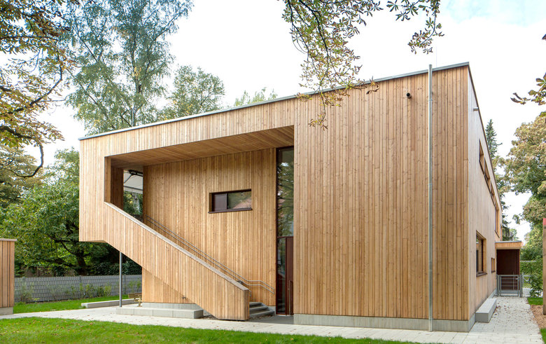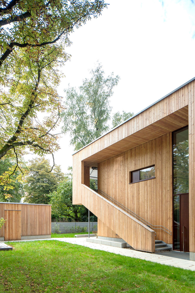Ein zweigeschossiges, lärchenholzverkleidetes Gebäude mit flachem Dach wird am nordwestlichen Rand des Grundstückes platziert. Westlich vorgelagert zur Alten Allee bleiben die alten Laubbäume erhalten und bilden eine baumüberstandene, sonnengeschützte Spielfläche. Durch das Gewirr der Stämme und Äste hindurch fällt der Blick des Passanten auf das hölzerne, rötlichbraune Gebäude mit seiner markanten Aussentreppe.