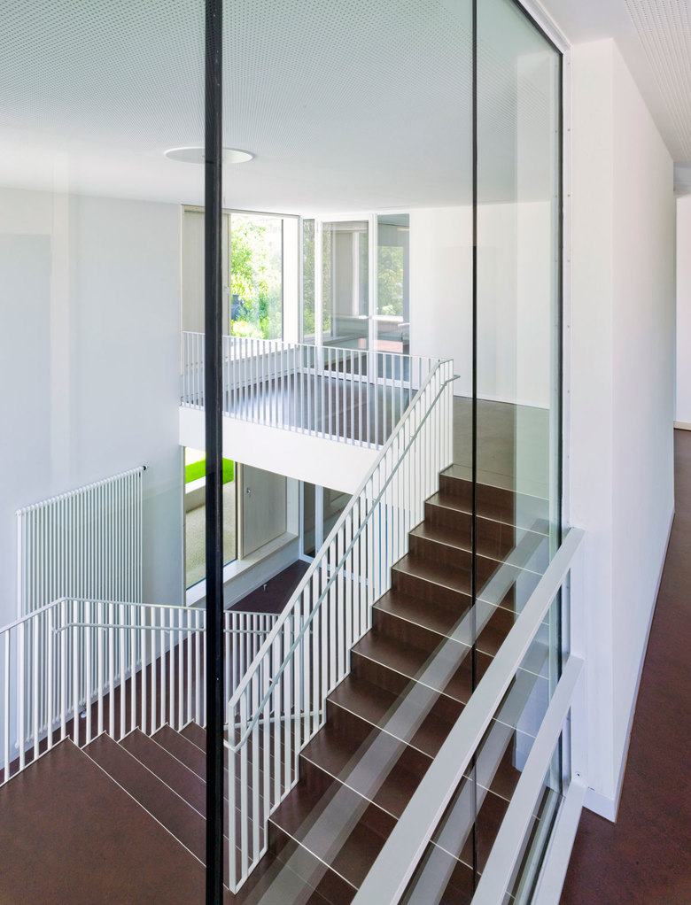 Besondere Gestaltungselemente der Kita sind u.a. die Fenster, die in ihrer Anordnung die Fassade beleben gegenüber der sonst rationalen Fassadengestaltung der umgebenden Gebäude. Die großen Öffnungen ermöglichen einen intensiven Innen-Außenbezug, sind gestaltprägend für die Fassade durch ihre Farbigkeit und gleichzeitig Sitzmöglichkeit im Inneren. Der sowohl aussen wie auch innen zurückhaltende Materialkanon bildet eine ruhige Atmosphäre für die vielfältigen Aktivitäten der Kinder.
