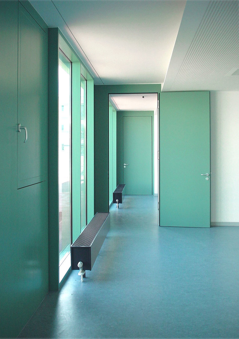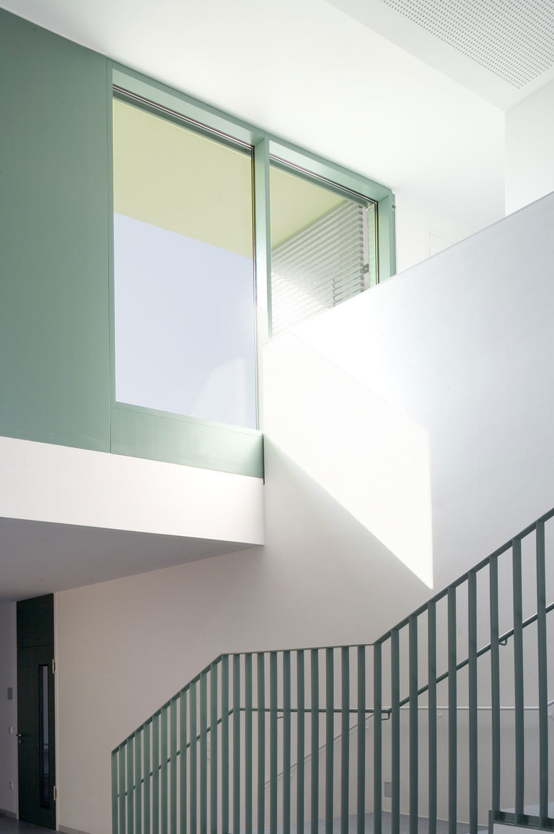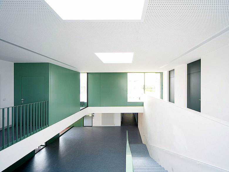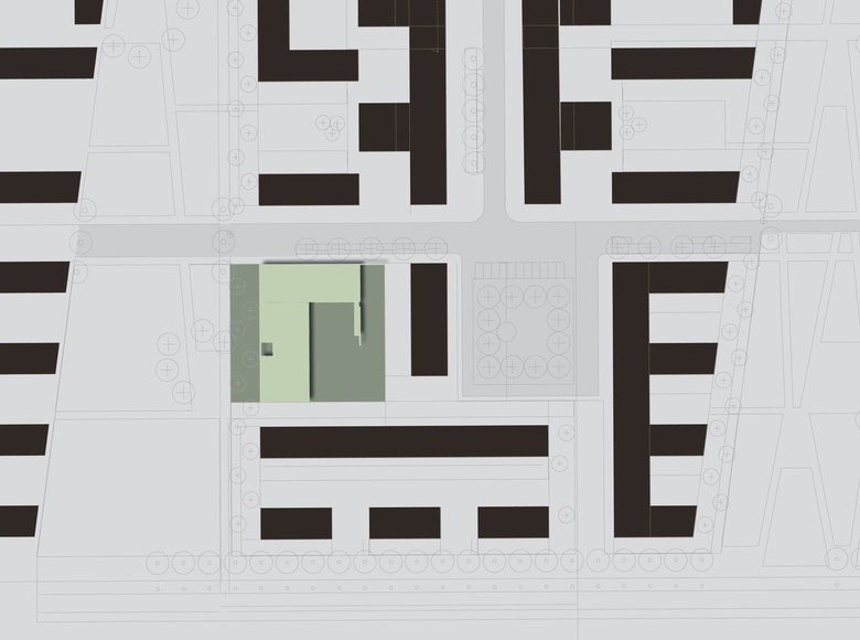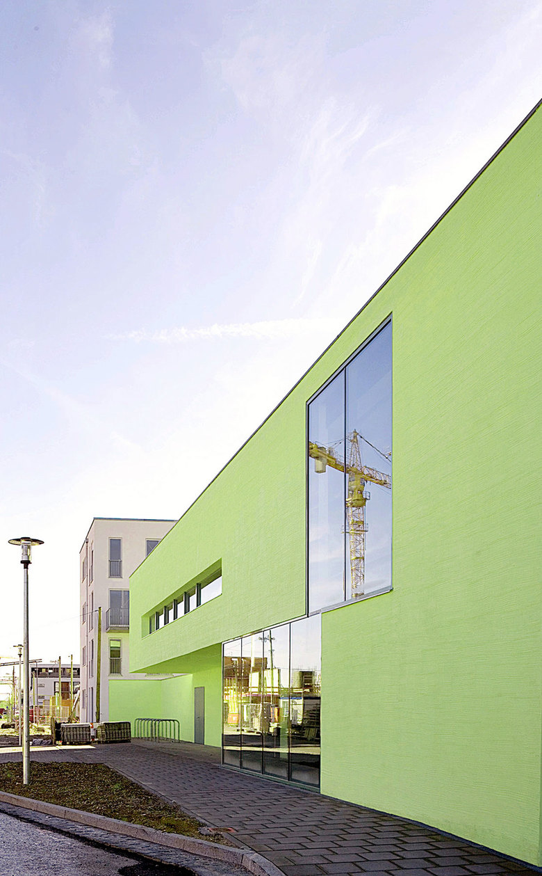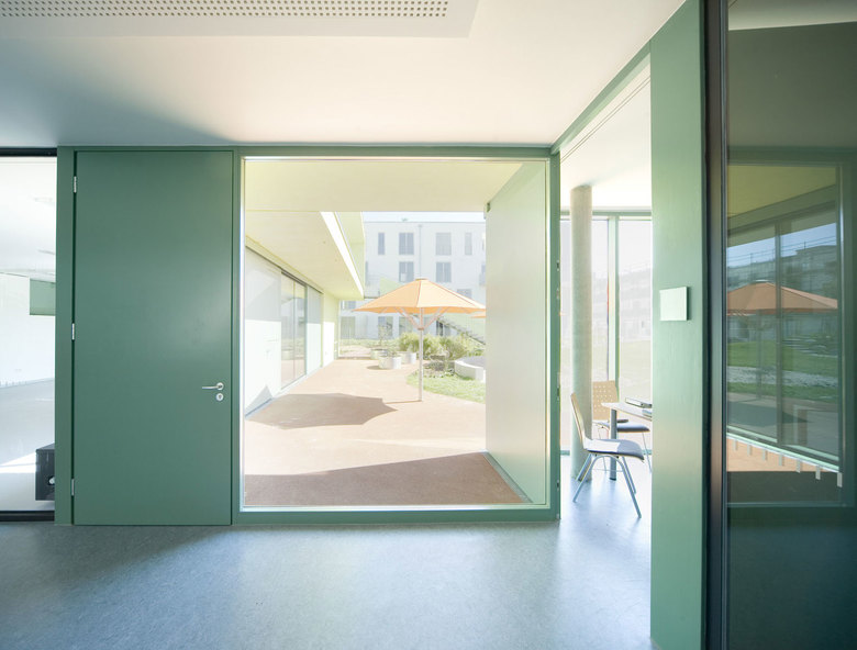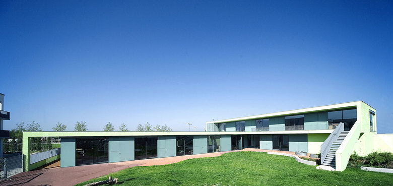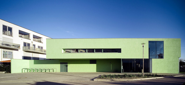 Ein winkelförmiger Baukörper – zweigeschossig zur Strasse, eingeschossig zum Grünzug – bildet im Zusammenspiel mit der umgebenden Wohnbebauung eine Hofsituation.