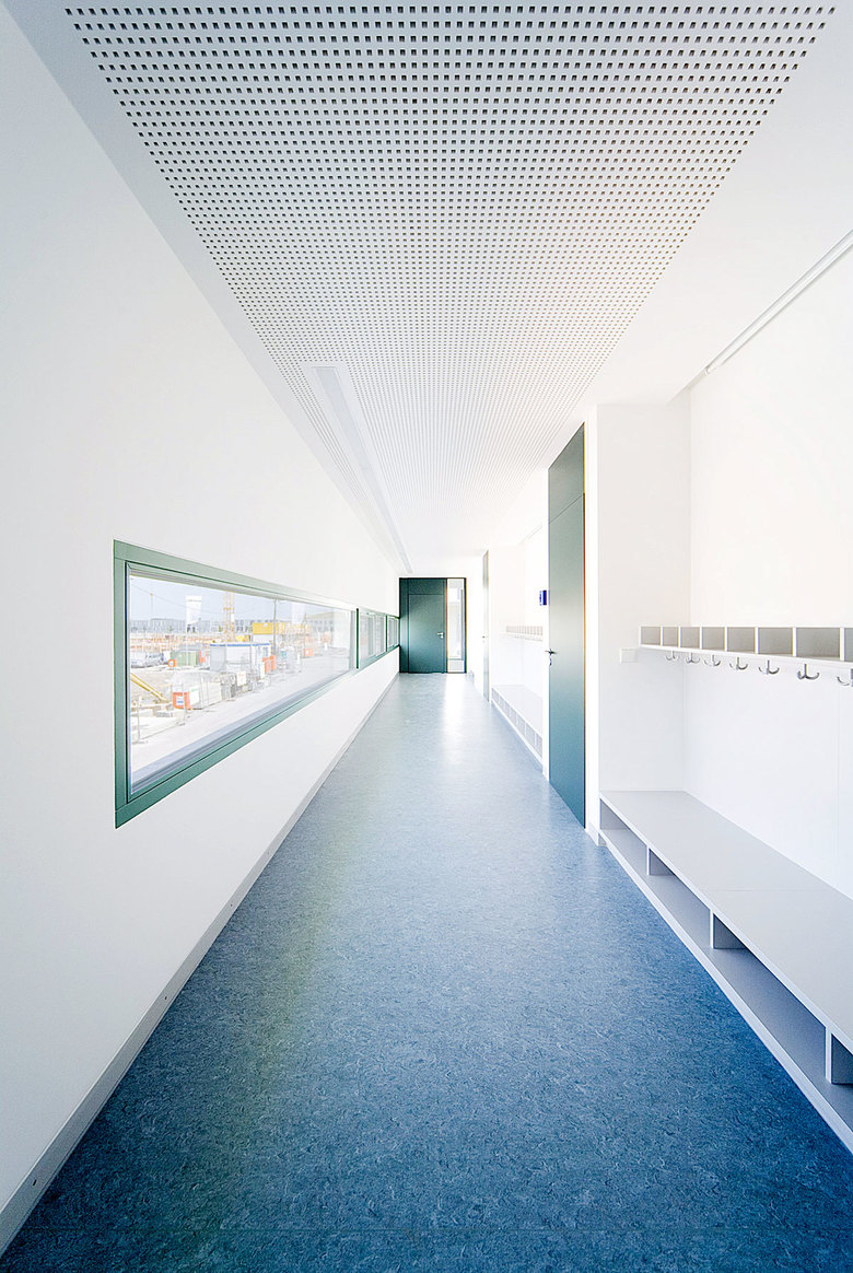 Das Gebäude ist als offenes Haus konzipiert. Der Flur mit seinen Aufweitungen, Ausblicken und Lufträumen ist als Spielzone verbindendes Element des Gebäudes. Kindergarten- und Krippengruppen sind zu gemischtaltrigen Gruppen zusammengefasst. Die Gruppenräume öffnen sich mit großzügigen Verglasungen zu den Freibereichen. Dies trägt einerseits zu einem verbesserten Innen- Außenraumbezug bei, bezieht die Natur unmittelbar ins tägliche Erleben der Kinder mit ein und sorgt andererseits für eine optische Vergrößerung der Räume.
