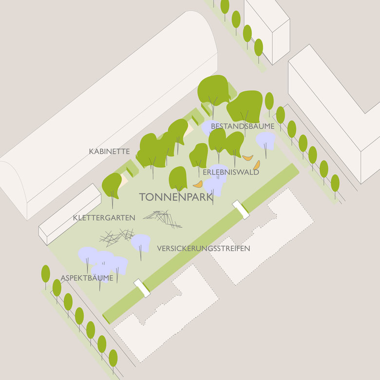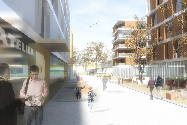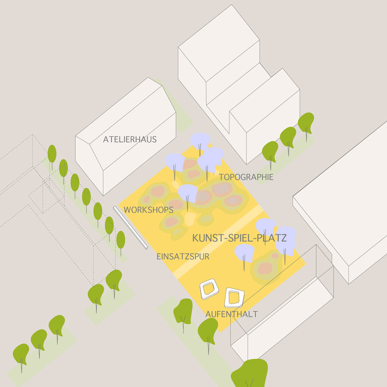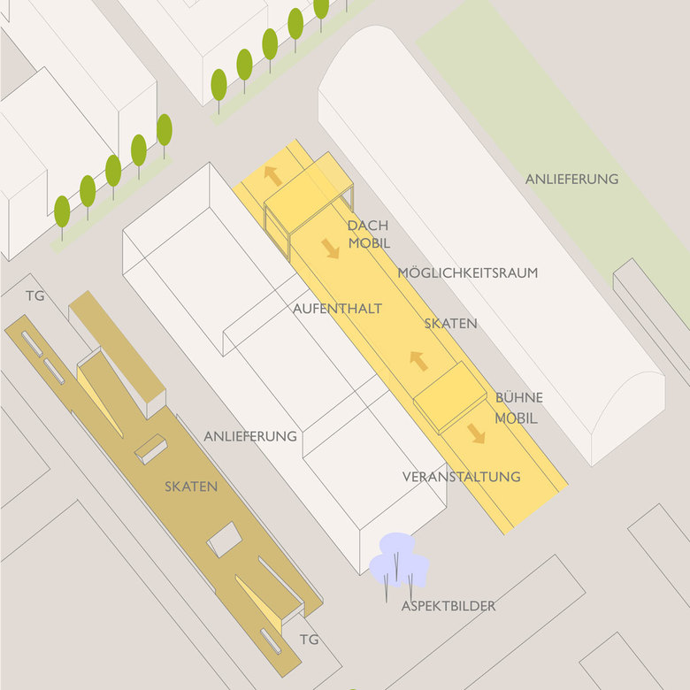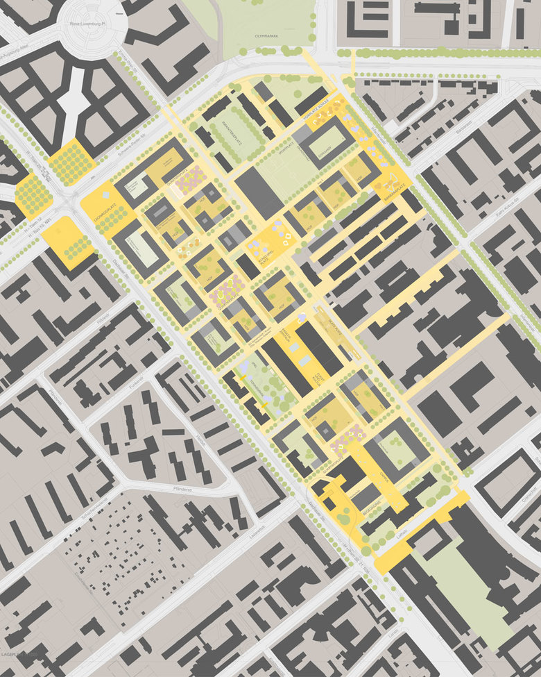 Zwischen diesen Ankerpunkten erstreckt sich ein System aus Gassen, die als Shared Space allen Nutzergruppen zur Verfügung stehen und weitgehend gestaltungsoffene Flächen mit Hinterhofcharakter sollen die Möglichkeit für künstlerisches Schaffen im Quartier wahren.