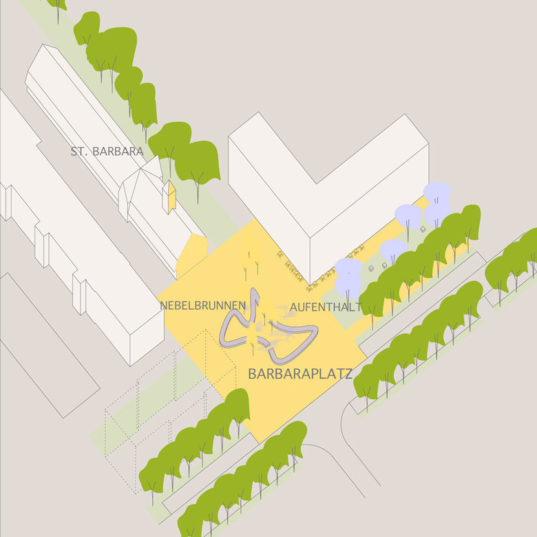 Der Bereich zwischen Tonnenhalle und Jutierhalle bildet ein neues Zentrum für die kreative Szene. Im südlichen Bereich wird der Hochschule eine zentrale Campusfläche als Ort der Begegnung und studentischen Lebens hinzugefügt. Die Kirche St. Barbara wird Ausgangspunkt für einen Platz mit kleinstädtischer Atmosphäre, geprägt von Gastronomieflächen und einem Nebelbrunnen.