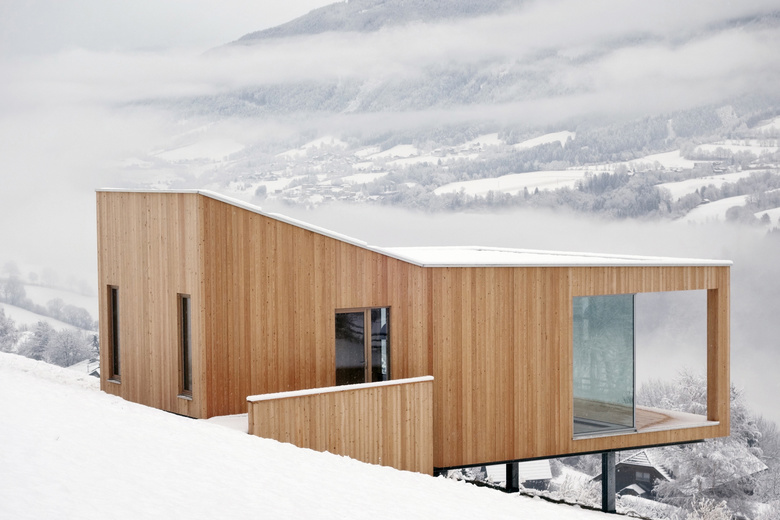 Auf einem Stahlgerüst ruhend folgt der Boden des vorgefertigten Holzbaus dem Hangverlauf um sich im talseitgen Abschnitt davon zu lösen und sich dem Tal entgegenzustrecken. Unter dem Haus bleibt durch die bodenschonende Bauweise ein Lebensraum für Flora und Fauna. Die vor allem für einen Holzbau kritische Zeit der Herstellung der Gebäudehülle bis zu dessen Dichtheit konnte so wesentlich verkürzt werden.