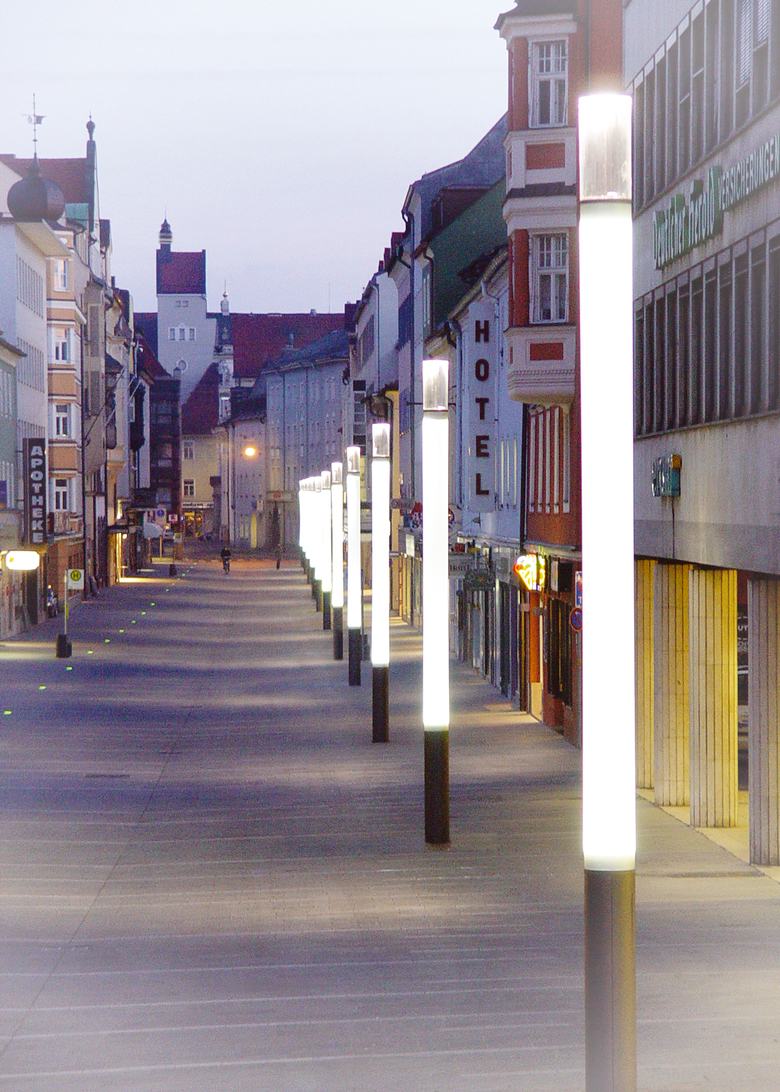 Die Stele selbst ist eine Neuentwicklung und sowohl Straßenleuchte als auch Licht-Kunst-Objekt. Sie weist eine dreiteilige Gliederung auf, bestehend aus einem Sockel für die Elektrotechnik, einem hinterleuchteten, mattierten Glaskörper und einem Leuchtkopf mit Lichttechnik. Der Leuchtkopf aus Klarglas, im oberen Bereich mit einem Freiformreflektor abgeschlossen, sorgt durch einen tiefer sitzenden Werfer, dessen Licht mittels einer Lichtfalle nach oben gelenkt wird, in erster Linie für die Ausleuchtung des Wegebereiches. Der aus innenseitig mattiertem Plexiglas bestehende Glaskörper wird von oben und unten mit weißen LED’s hinterleuchtet, wodurch die Stelen selbst zu Lichtobjekten werden.