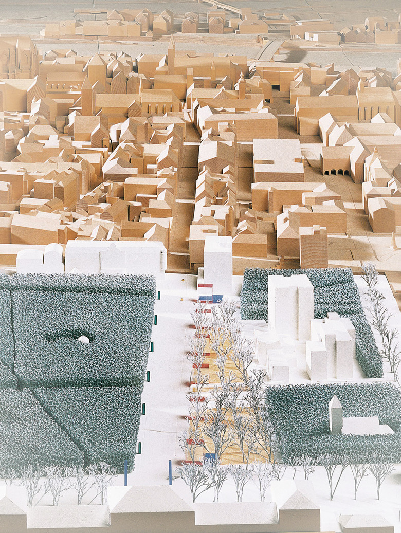 Der Grünbereich westlich der Esplanade wird als landschaftlich geprägter Park gestaltet. Er steht in einem spannungsvollen Gegensatz zur Esplanade. Eine Parkpasarelle schafft eine direkte Verbindung zur westlichen Innenstadt. Der Bahnhofsplatz bildet den Ausgangspunkt und Abschluss. Auf seiner Ostseite wird die fehlende räumliche Fassung durch ein Parkhaus und Sozialgebäude hergestellt. Der alte Friedhof erhält eine räumliche Umgrenzung durch eine semitransparente Lamellenwand und wird zu einem kontemplativen Rückzugsbereich.