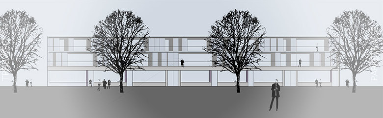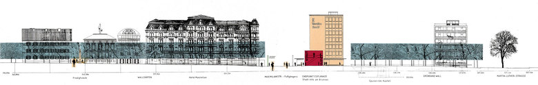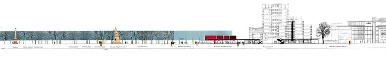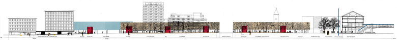 Dazu wird die Hauptverbindungsachse als neuer, urbaner Stadtraum in Form einer Esplanade gestaltet. Eine Reihe von sechs Glaspavillons rhythmisiert den Weg zum Bahnhof und setzt neue Nutzungsschwerpunkte durch Ausstellungen, Information, Präsentation, Cafes etc.