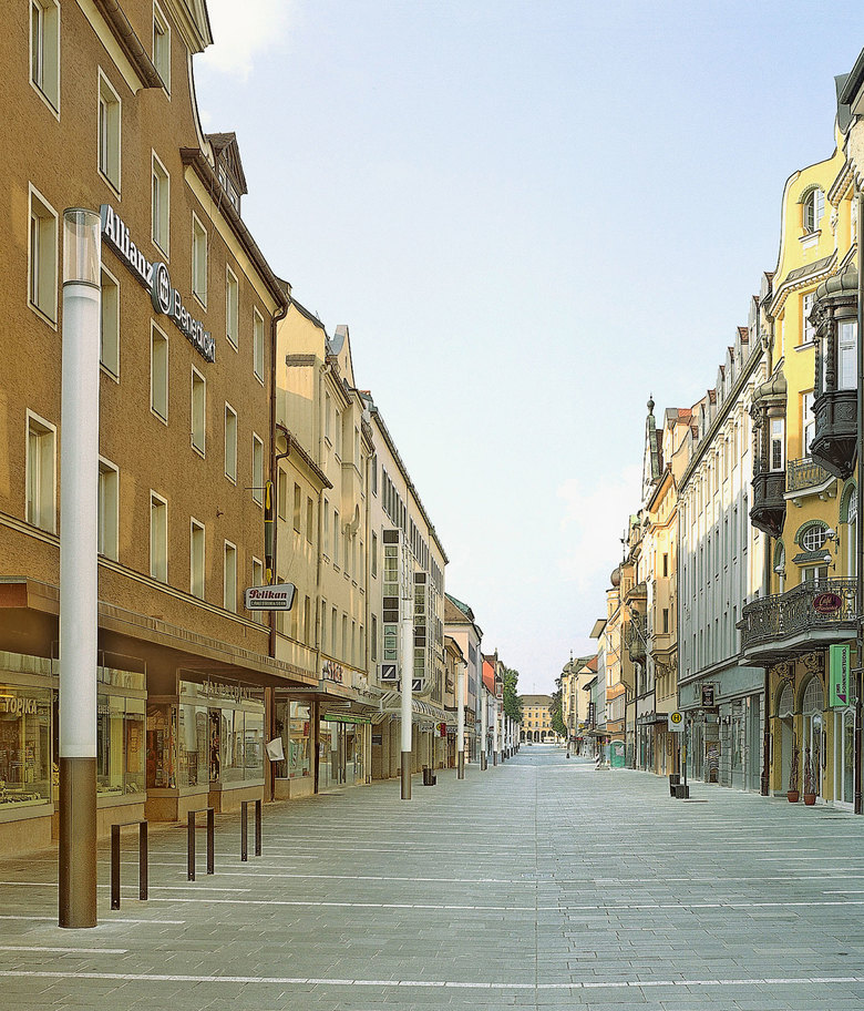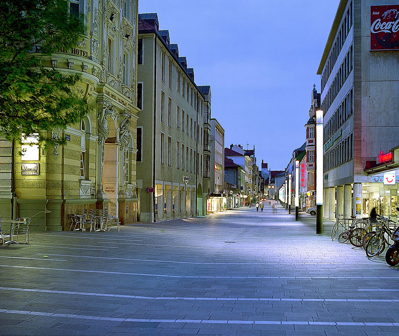 Ziel war es auf dieser Verbindungsachse in die Altstadt ein über die reine Zweckbeleuchtung hinausgehendes Beleuchtungskonzept zu entwickeln und eine blendfreie Ausleuchtung der Wegebereiche mit geplanten Licht-Schatten-Zonen zu schaffen. Dazu wurden Lichtpunkte entlang der Westseite in den Boden eingelassen und auf der gegenüberliegenden Seite Stelen platziert, die eigens für die Maximilianstrasse entwickelt wurden.