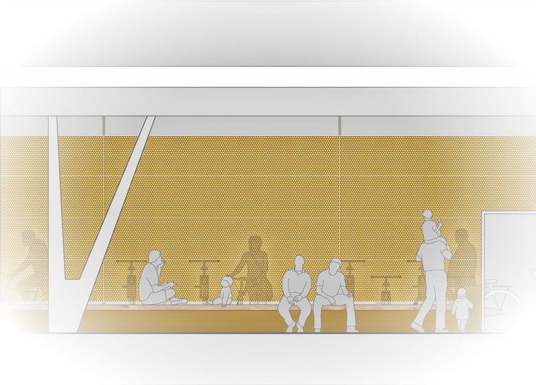 Im östlichen Bereich erweitert sich die dem Wartebereich zur Verfügung stehende Fläche . Hier schließt ein erkennbar als Nebendach ausgebildetes Dach an das Hauptdach an. Unter diesem Dachteil befinden sich die Wartebereiche für die Fahrgäste. Den Abschluss dieses Bereiches bildet eine Rückwand aus fein perforiertem Lochblech. Dieses sollte zusammen mit der hier vorgeschlagene Verkleidung des EG Bereiches des anschließenden Gebäudes über einen weiteren Wettbewerb künstlerisch gestaltet werden und so zum Signet des Bahnhofes werden. Die im Plan dargestellte goldenen Farbe steht symbolisch für die künstlerische Gestaltung. Die Perforierung der Rückwand lässt den hinter dem Sitzbereich angeordneten Fahrradabstellbereich erkennbar werden, so dass zwischen beiden Bereichen Sichtkontakt besteht. Dies trägt zur Vermeidung von Angsträumen bei. Aus dem Fahrradabstellbereich gibt es direkte Zugänge in den Wartebereich.