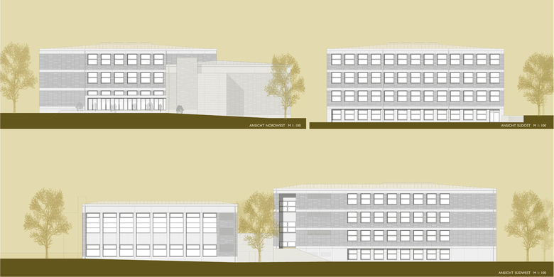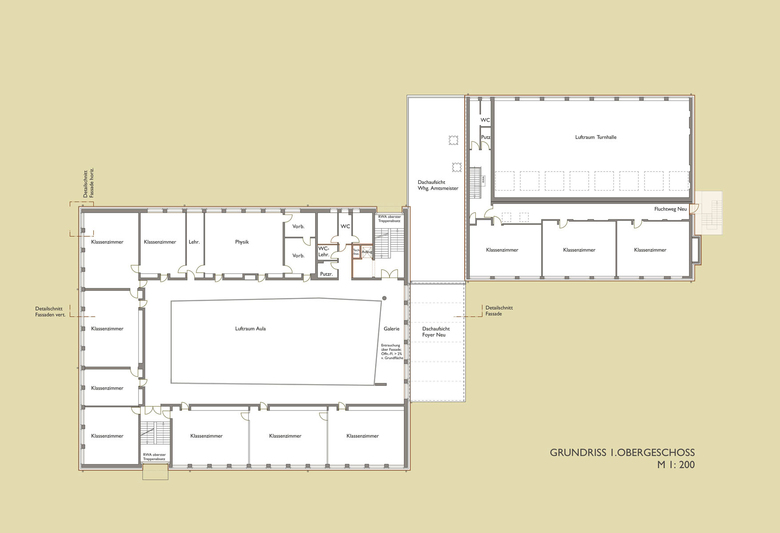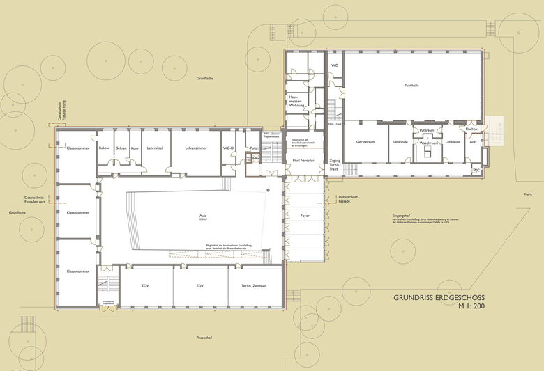 Neben der Überprüfung der Flucht- und Rettungswege des Gebäudes und der Herstellung einer barrierefreien Nutzbarkeit, war der Neubau eines Foyers, Teil des Wettbewerbs. Das geplante Foyer befindet sich unmittelbar vor dem heutigen Haupteingang und verbindet das Hauptgebäude mit dem Turnhallentrakt. Die Aula im Erdgeschoss des Hauptgebäudes erhält durch das neue Foyer einen angemessenen Vorbereich, macht sie für Veranstaltung attraktiv und bindet sie unmittelbar an den Schulhof an.