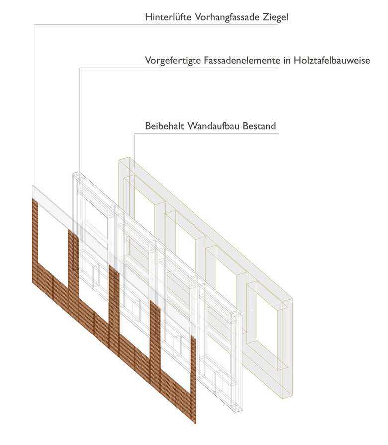 Der Entwurf nimmt die bestehenden Bezüge innerhalb der Stadt Vilsbiburg auf und behält den vorhandenen Materialkanon bei. Der vorhandene Wandaufbau bleibt unverändert und erhält durch vorgefertigte Tafelelemente, die notwendigen energetischen Verbesserungen und durch die vorgehängte hinterlüftete Ziegelfassade eine moderne Gestalt. Der größte Vorteil der vorgefertigten Elemente ist die verkürzte Montagezeit, die eine abschnittsweise Ausführung auch während dem laufenden Schulbetrieb möglich macht.